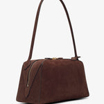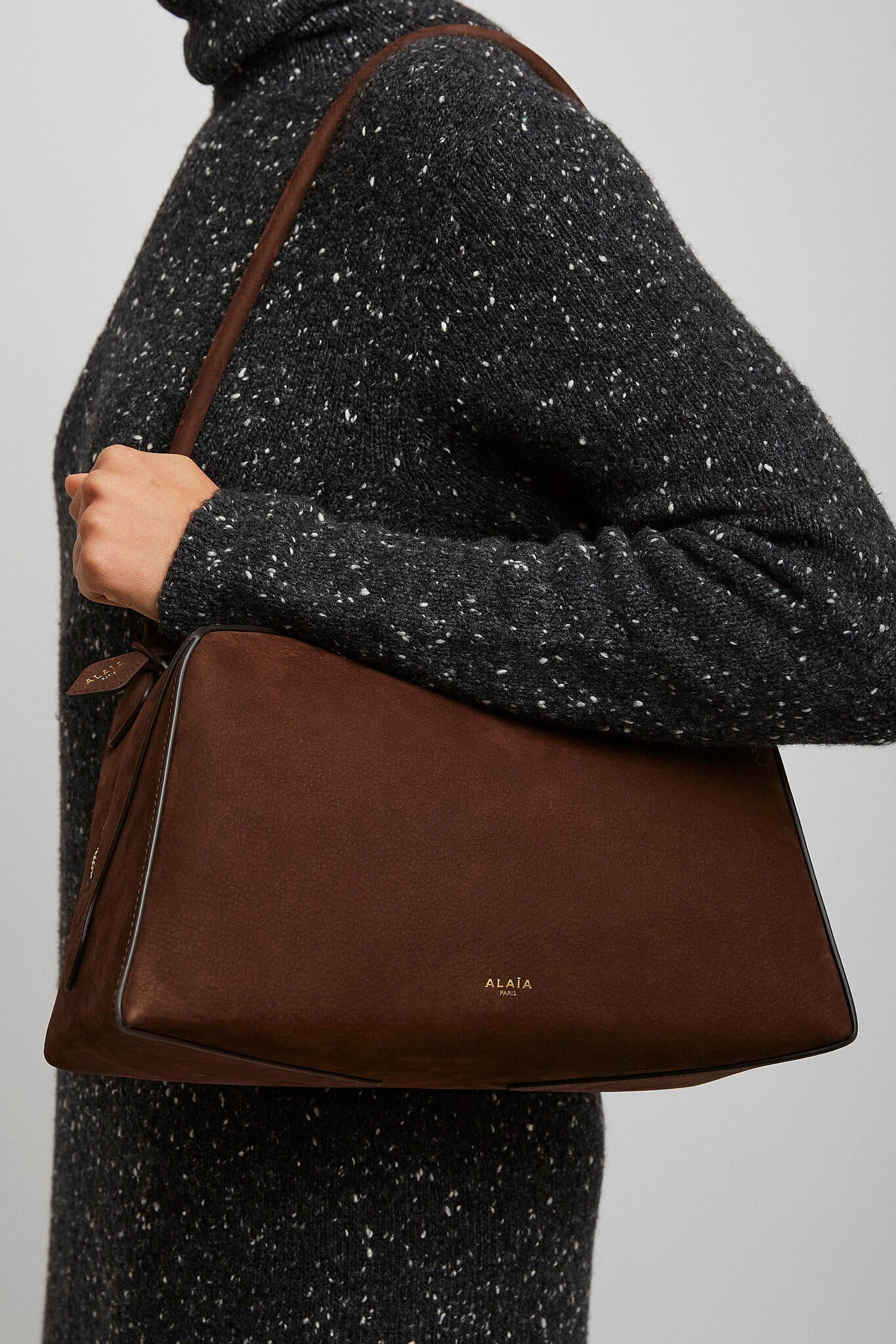 Brown nubuck shoulder bag from Alaïa. The Le Bouledogue Medium bag is made of nubuck with diagonal tubular handles with decorative ties and a double zip closure.