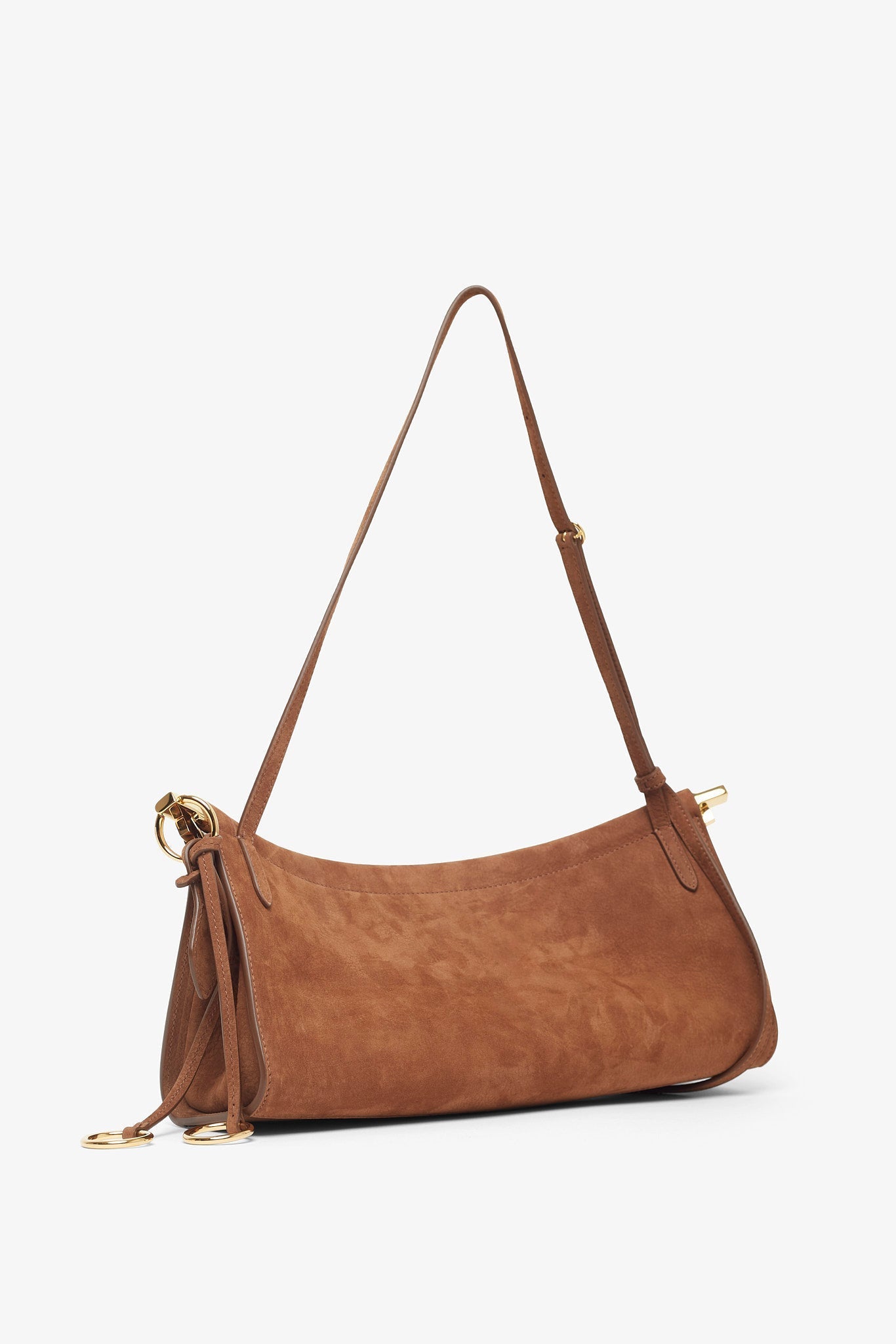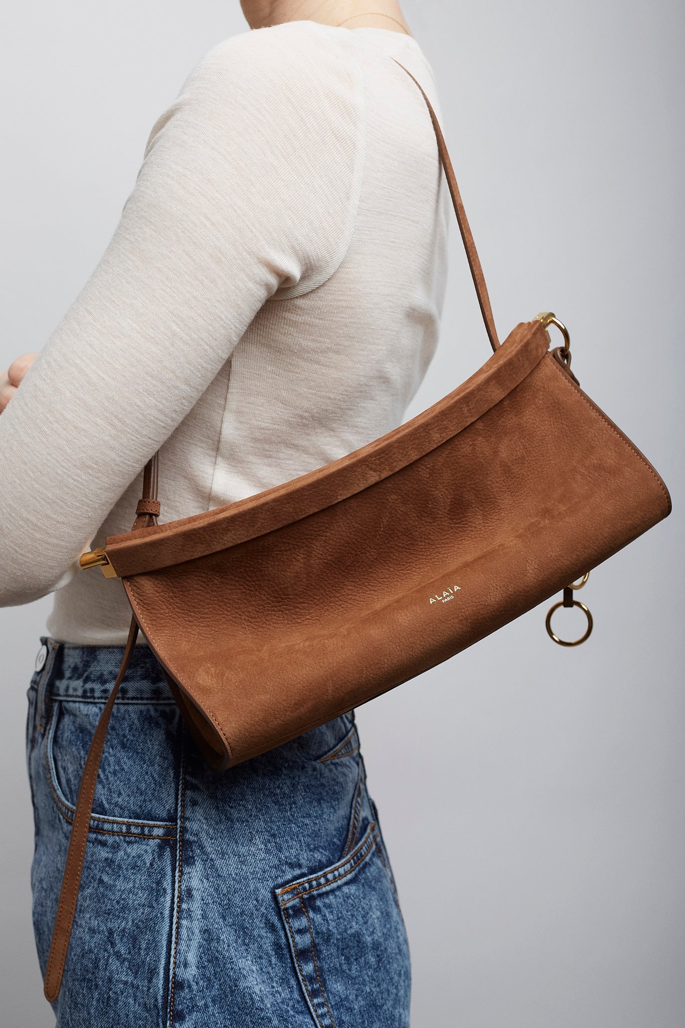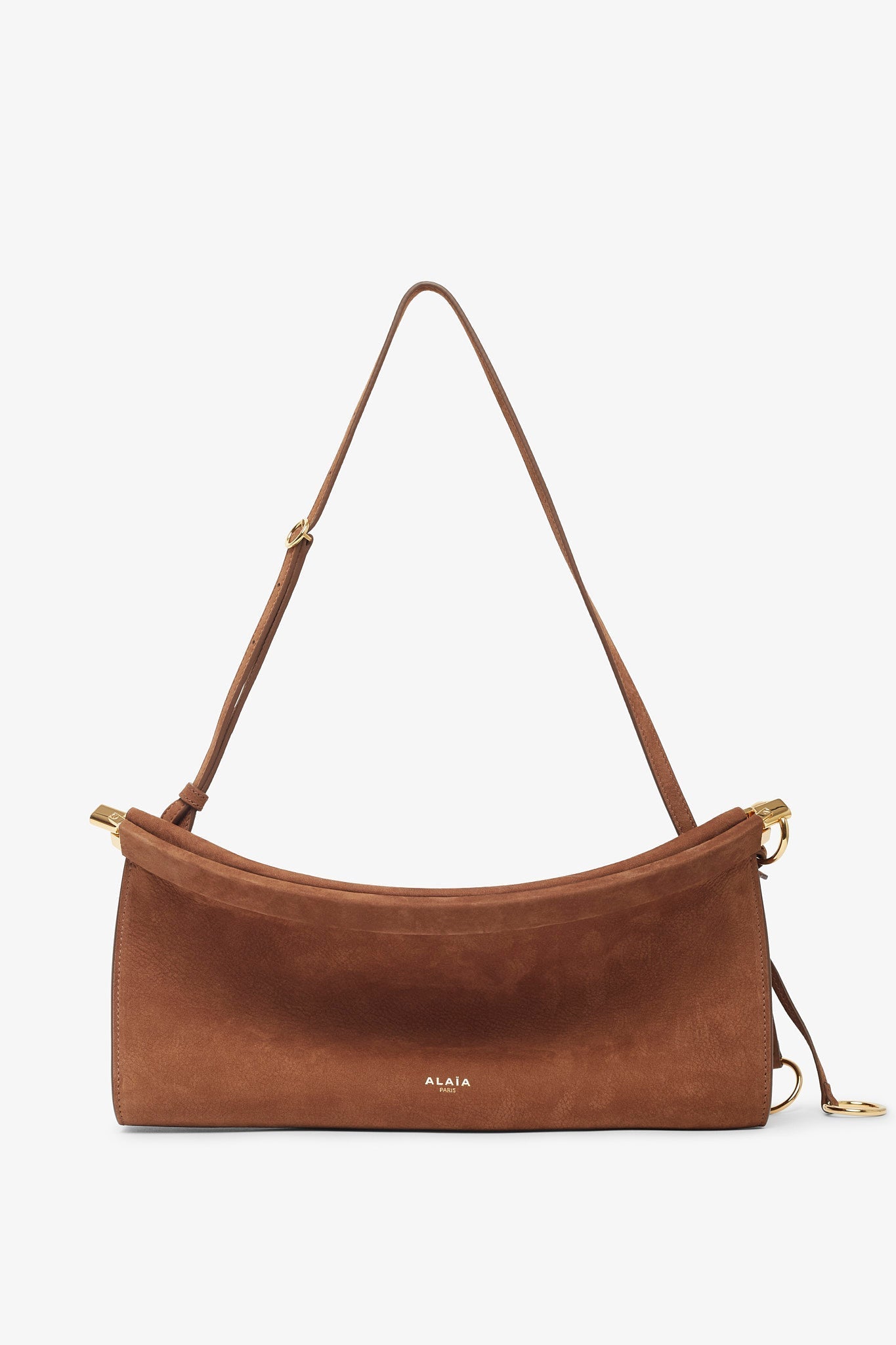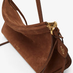 Brown nubuck suede shoulder bag from Alaïa. The Le Click East West medium shoulder bag is made of soft nubuck suede leather in a curved silhouette that hugs the body, featuring a hinge opening system, decorative ties with metallic rings, an adjustable strap and suede leather lining inside.