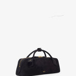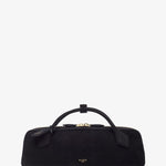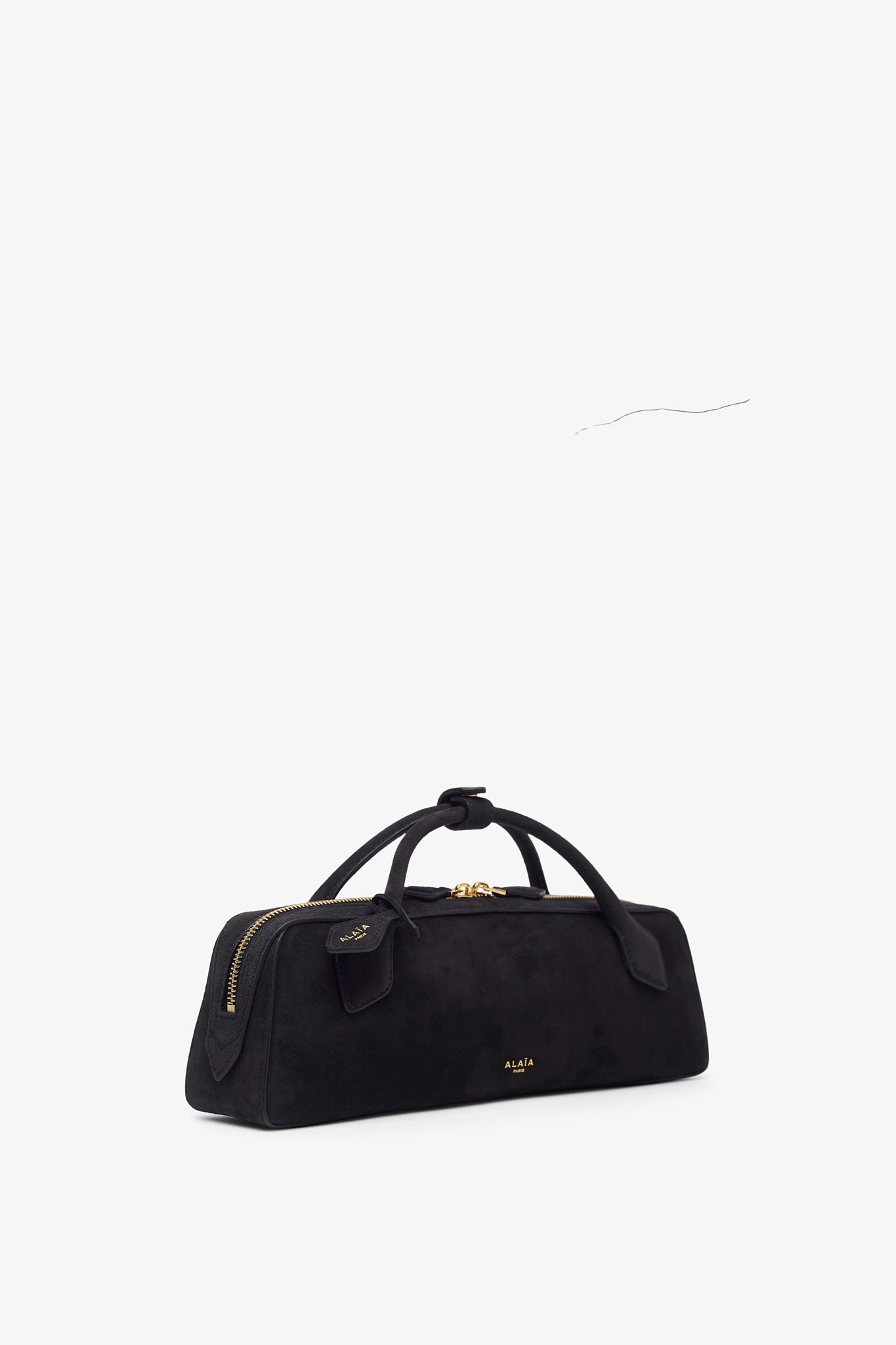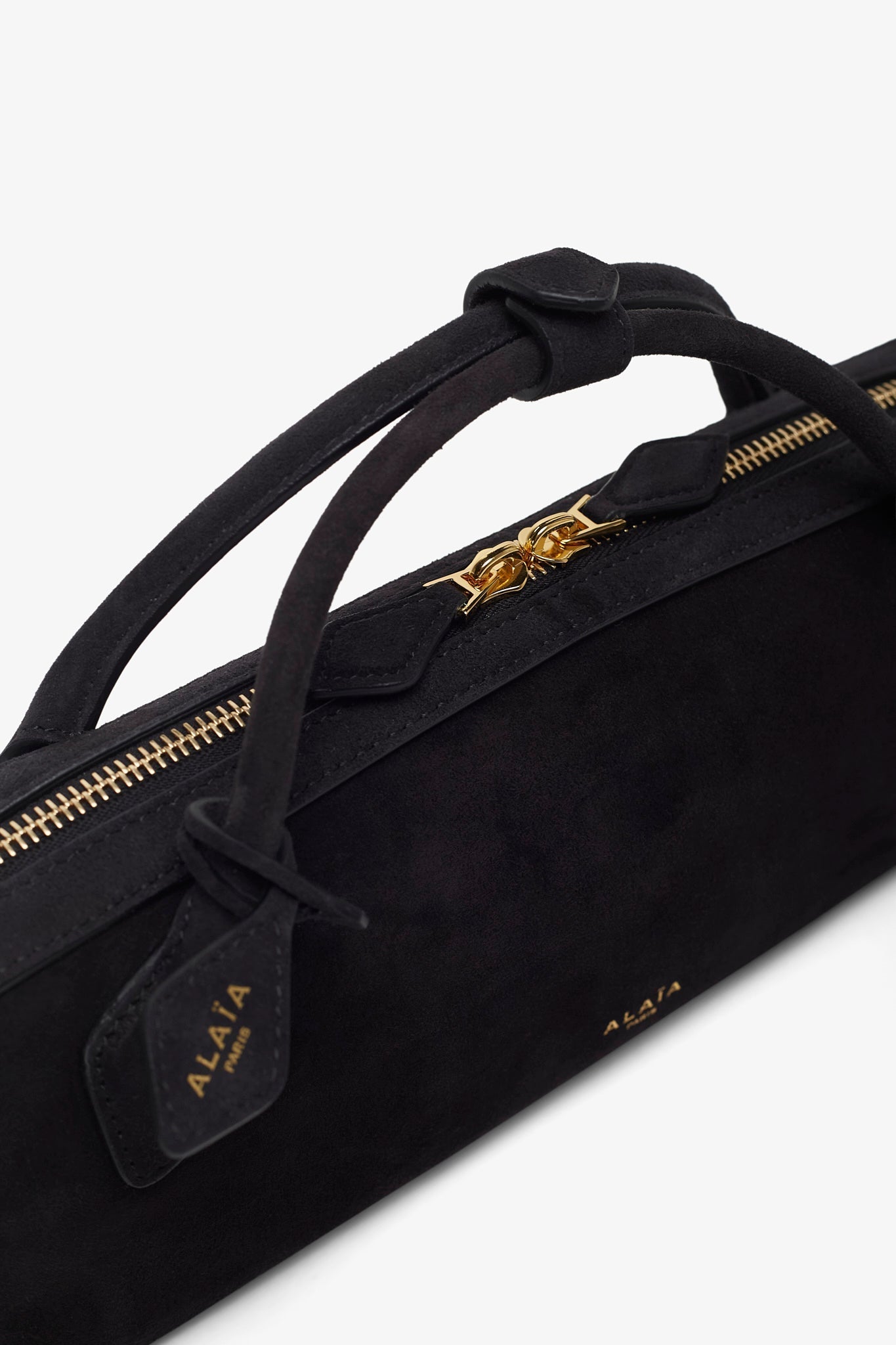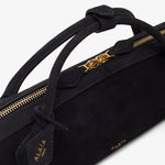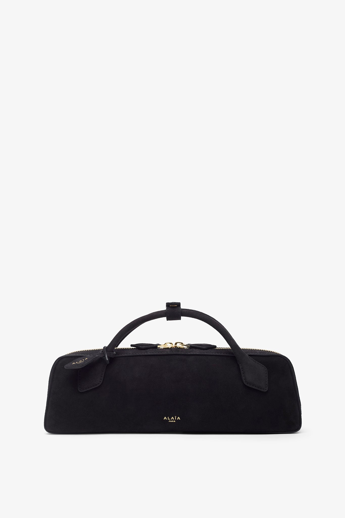 Black suede clutch bag from Alaïa. The Teckel clutch bag is made of suede with two top handles, a two-way gold-toned zipped top complete with an internal slot pocket.