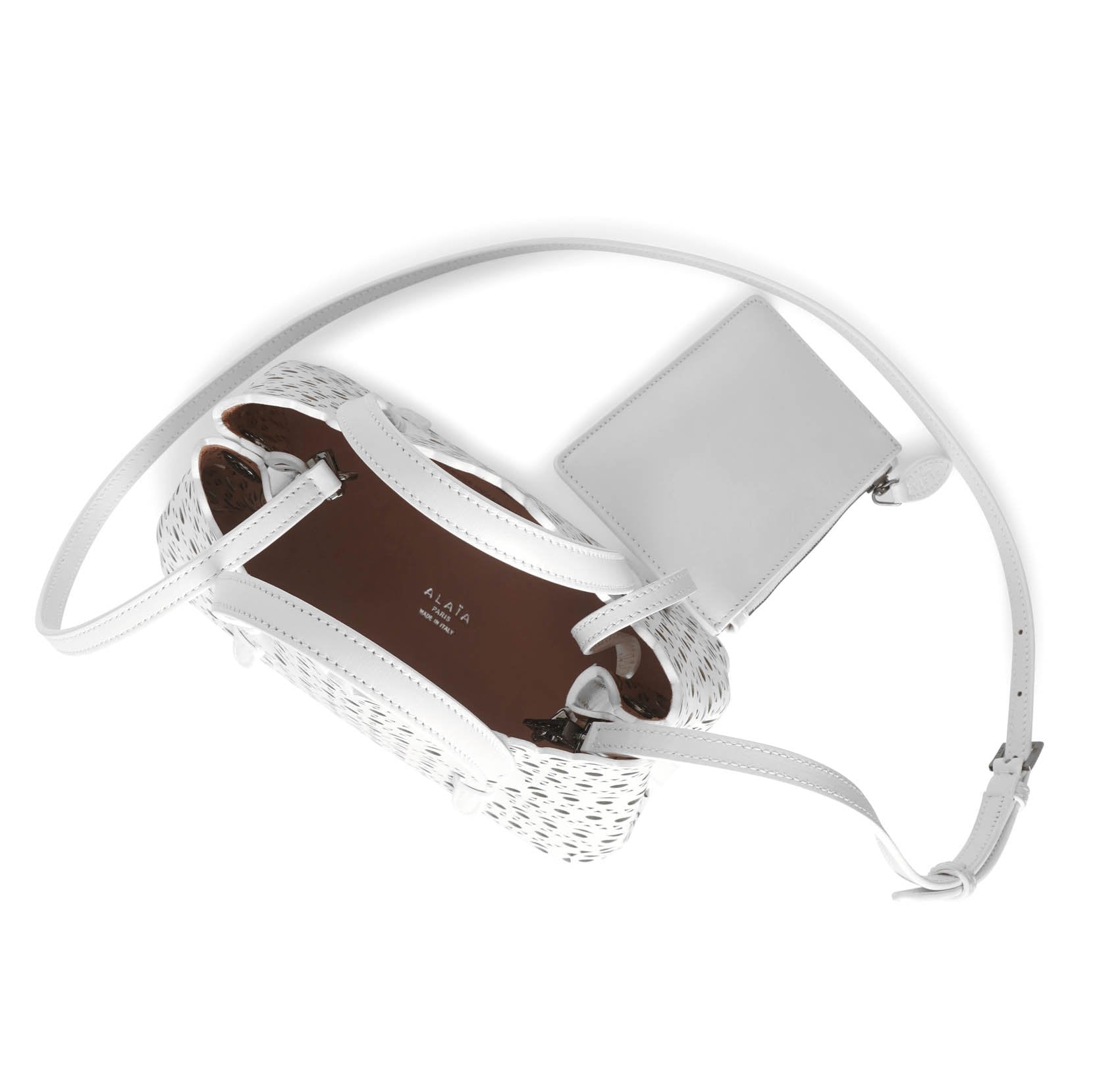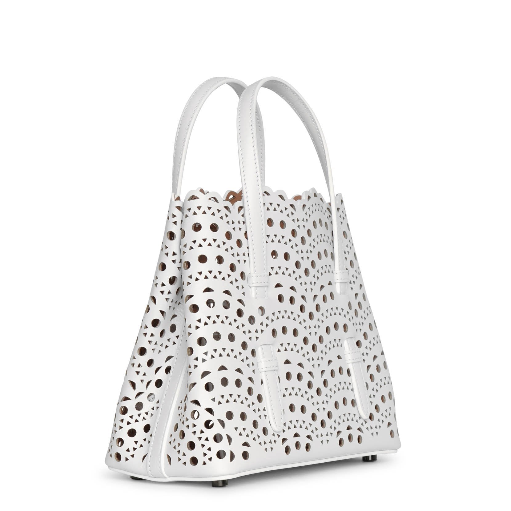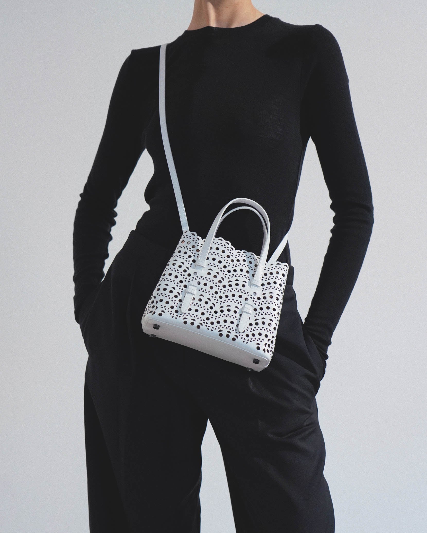 White leather tote bag from Alaïa. The tote has two top handles and an optional cross-body strap, along with an unlined finish.