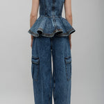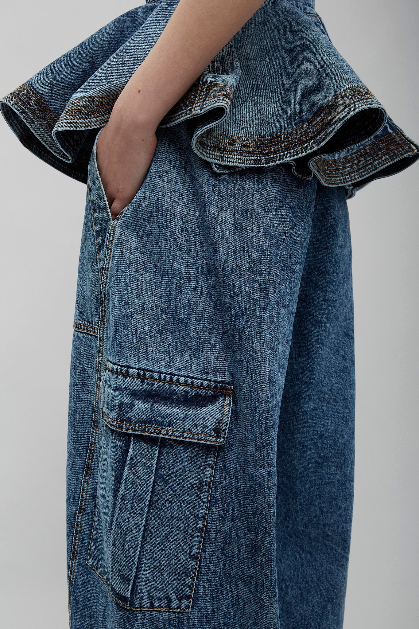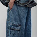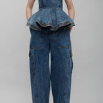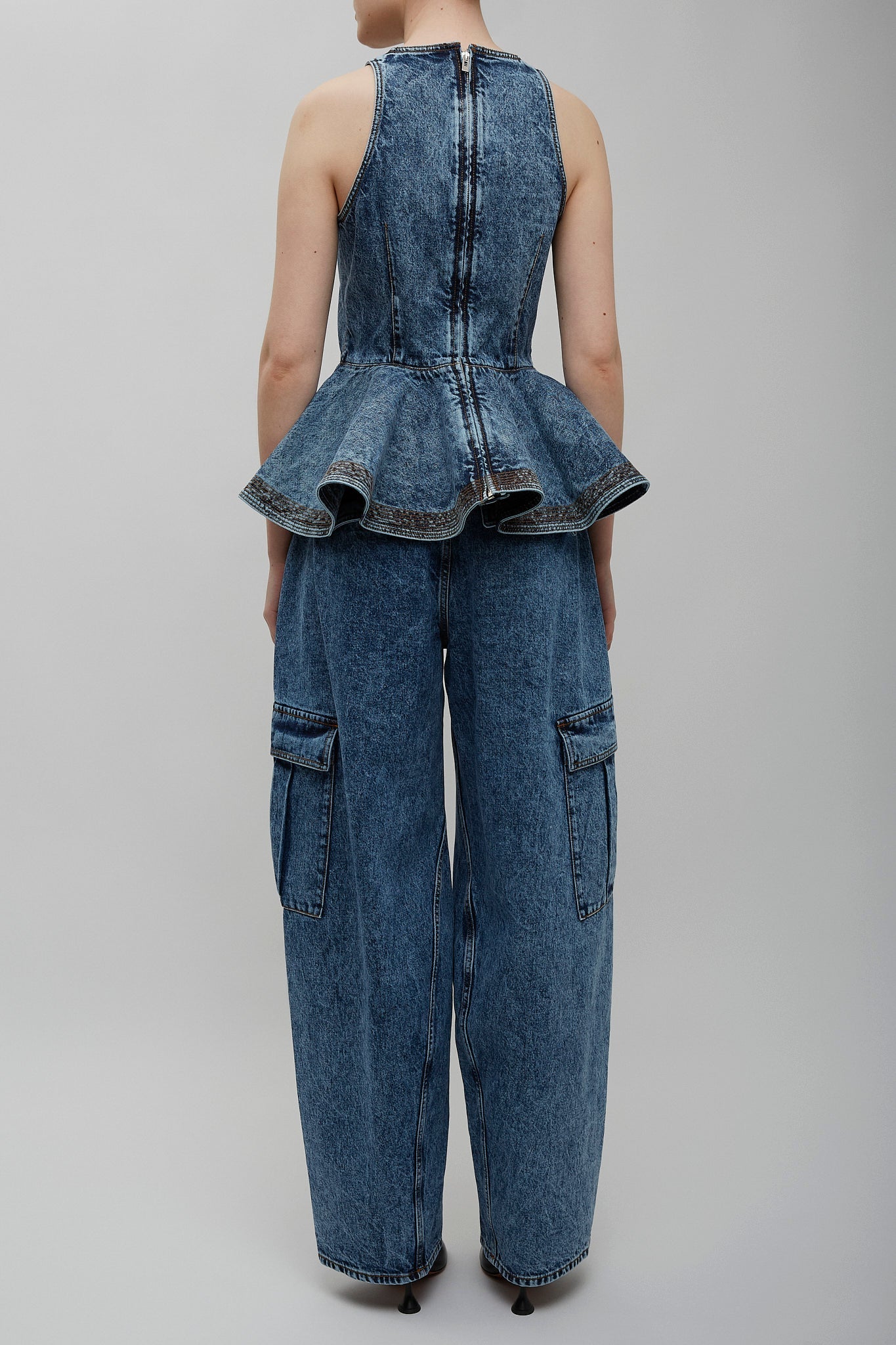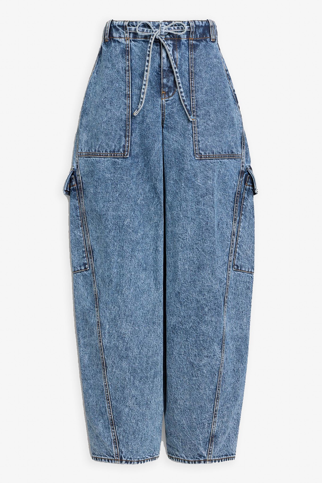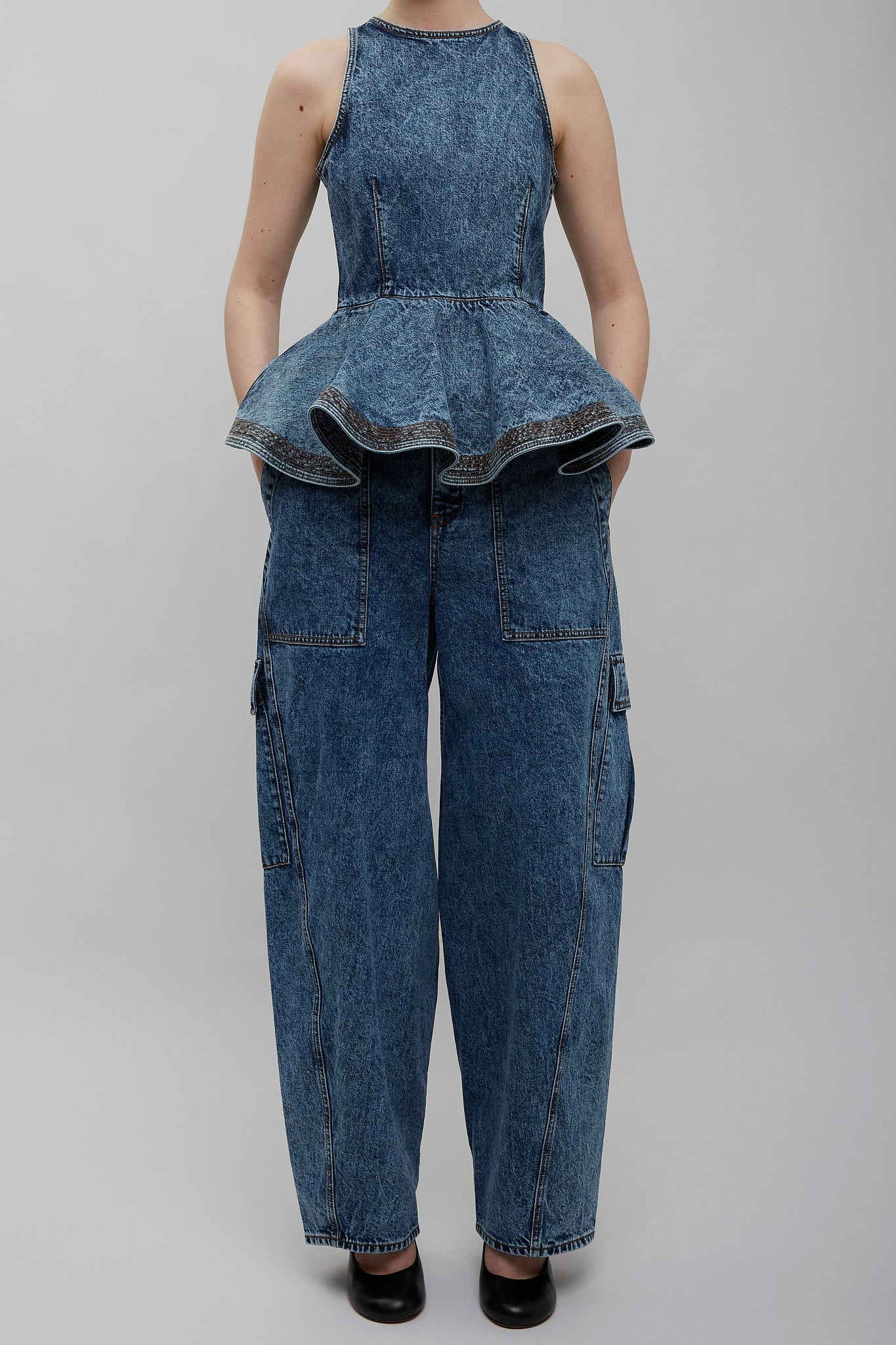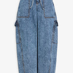 Blue denim pants from Alaïa. The Cargo jeans are made in snow denim with barrel leg, low waist with zip fly and silver hardware. They have side seam pockets, welt back pockets and side cargo pockets with flap, complete with twisted topstitchings.