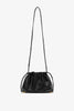 Black leather crossbody bag from The Row. The Angy bag is made of smooth nappa leather with a drawstring closure, long shoulder strap complete with an engraved logo hardware.