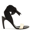 Two-tone elastic ribbon sandals from Proenza Schouler. The sandals have a 55mm heel, a rounded toe and a rubber toe strap with tonal leather lining and black elastic ribbon ties around the ankle.