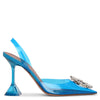Blue PVC slingback pumps from Amina Muaddi. The Begum glass pump is made from blue PVC with the designer's signature "Martini" heel, along with an elegantly pointed toe complete with crystal-embellished buckles at front.