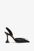 Black leather slingbacks from Amina Muaddi. The Begum slingback pump is the designer's signature style. It is made from black leather, mounted on a 95mm sculptural "Martini" heel, an elegantly pointed toe complete with a crystal-embellished buckle at the front.