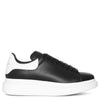 Black and white leather sneakers from Alexander McQueen. The Classic sneakers have a rounded toe and an exaggerated sole and a denim blue suede heel detail complete with embossed logo..