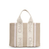 Light pink linen canvas tote bag from Chloé. The Small Woody bag is made of linen canvas detailed with shiny calfskin strips, along with the signature Chloé logo ribbon. It is complete with a main compartment designed to fit your mobile phone.