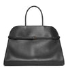 Black leather tote bag from The Row. The Margaux belt bag is made of black polished saddle leather with a delicate belt closure detail, gusseted side panels and interior closure. It has a capacious silhouette, complete with double top handles .