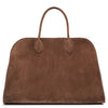 Brown suede tote bag from The Row. The Margaux bag is made of suede with a fabric lining, interior closure and silver fastenings. It has a capacious silhouette, complete with double top handles and belted gusseted side panels on both sides.