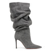 Grey denim booties from Amina Muaddi. The Jahleel booties are made of grey denim with piercing pointed toes and slouchy shafts, set on a slim stiletto heel measuring 95mm.