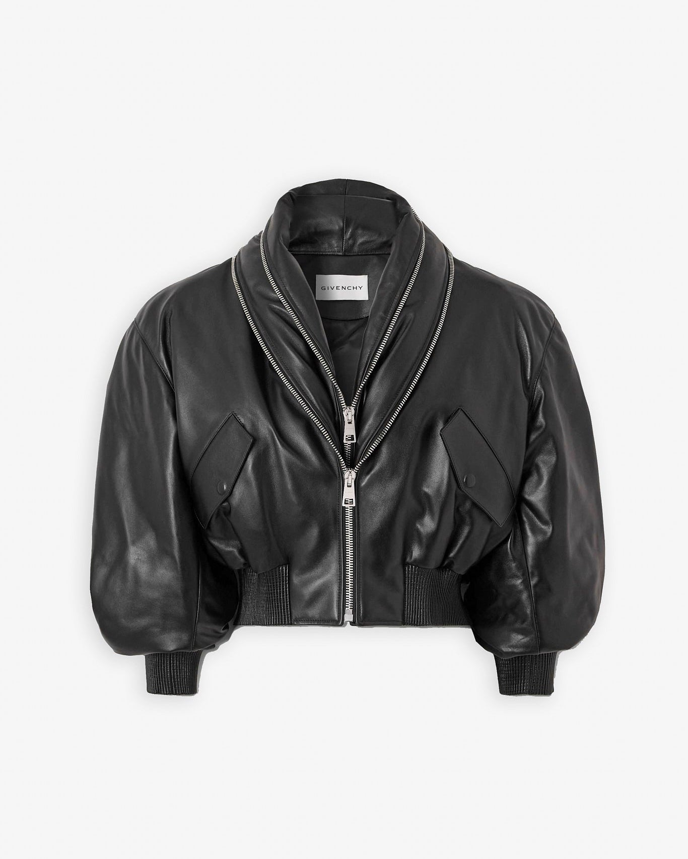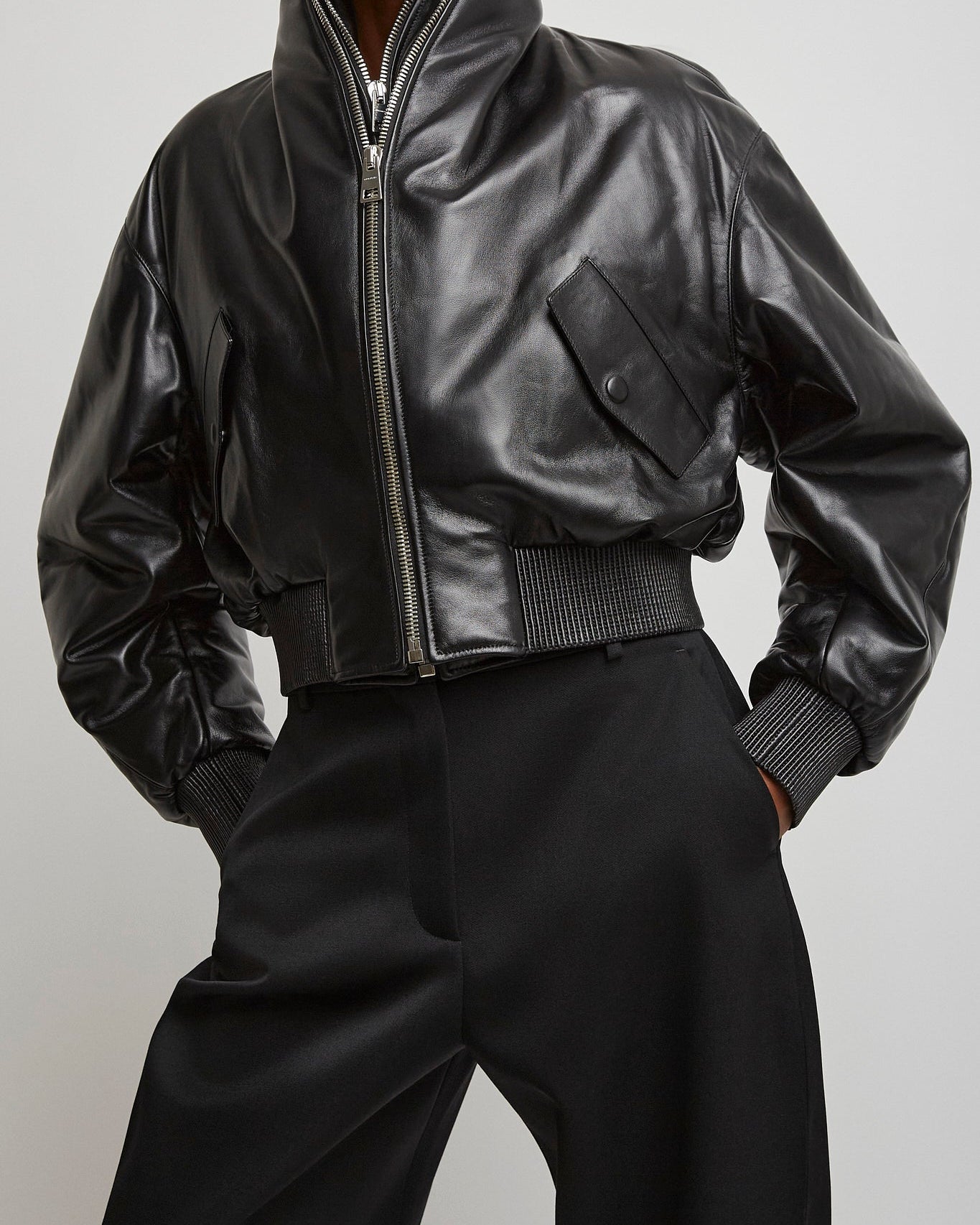 Zipped black leather bomber jacket