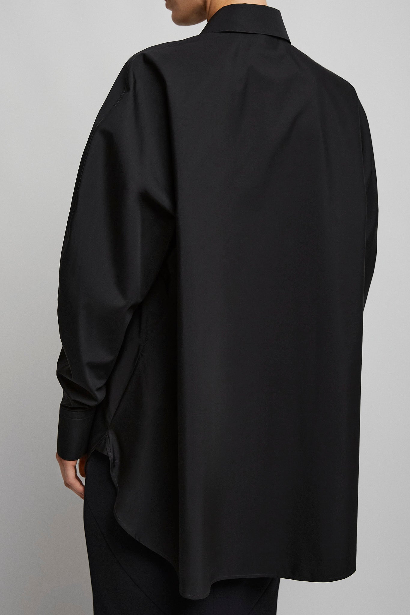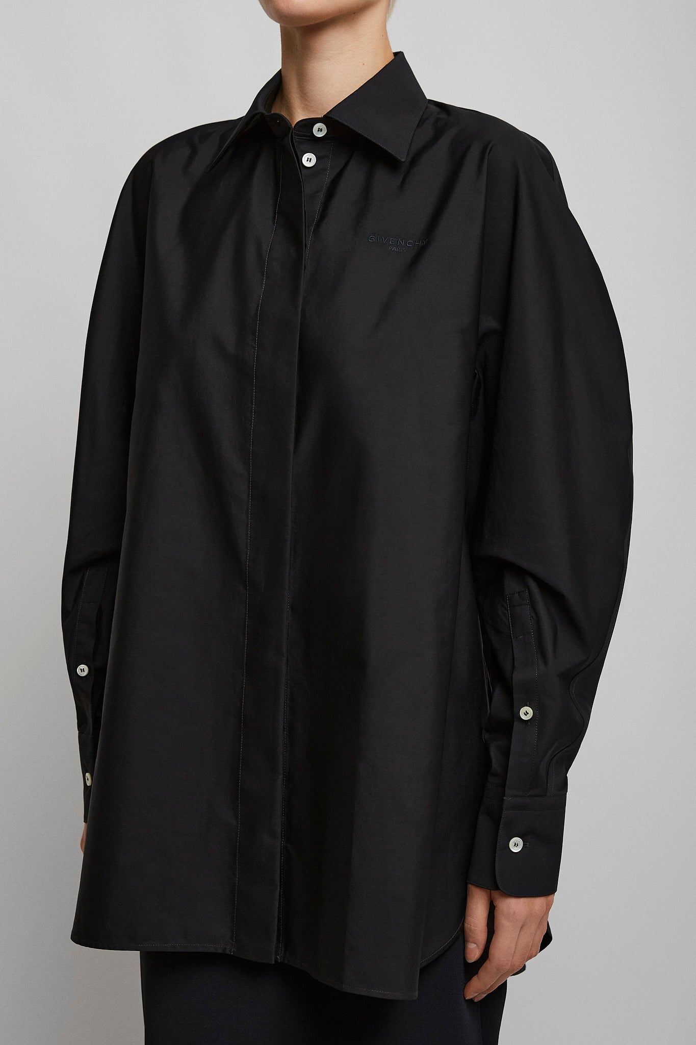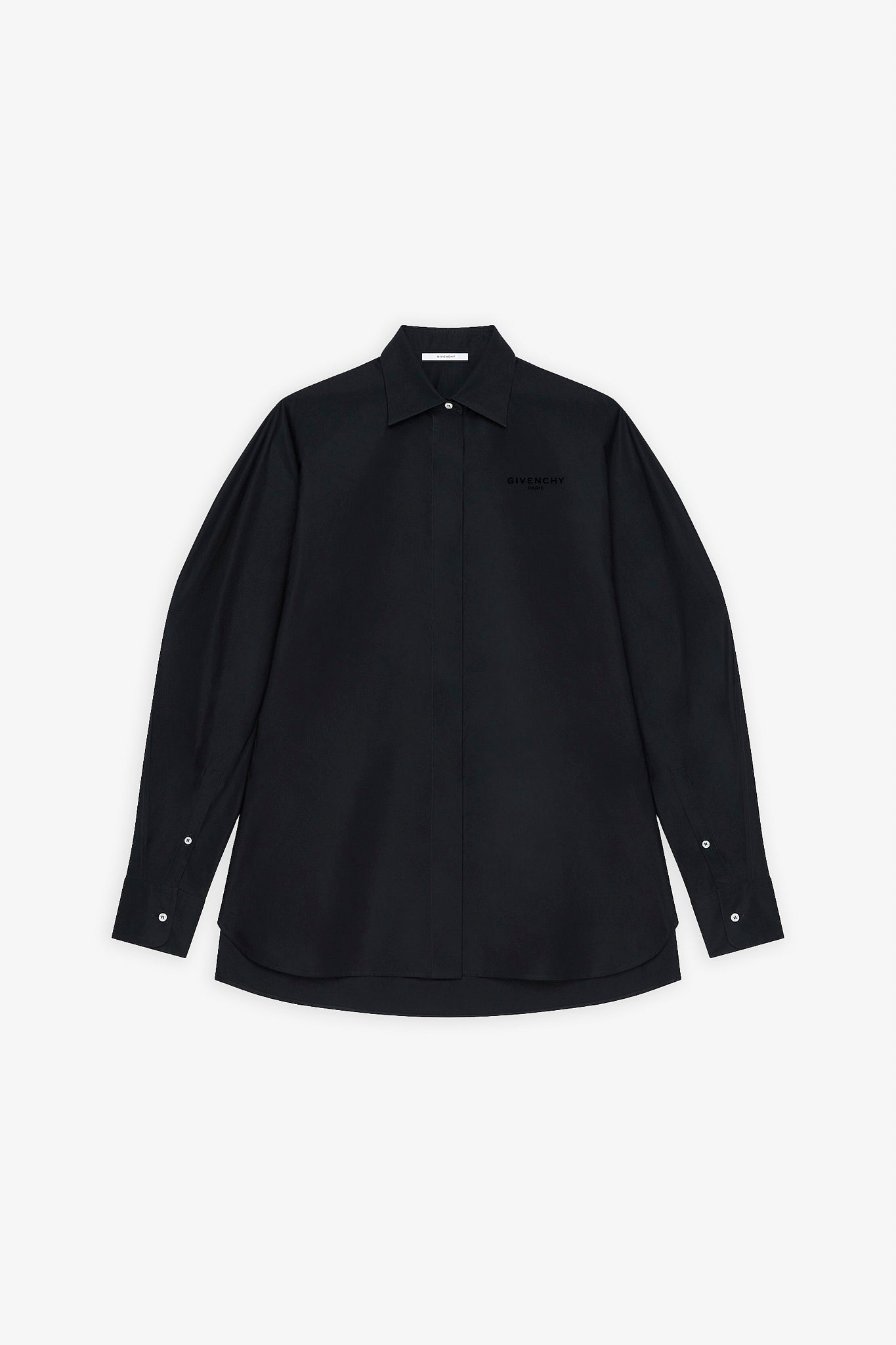 Black cotton shirt from Givenchy. The Cocoon long-sleeved shirt is made in cotton poplin with a classic collar, a small logo embroidered on the chest, hidden button closure and buttoned cuffs.