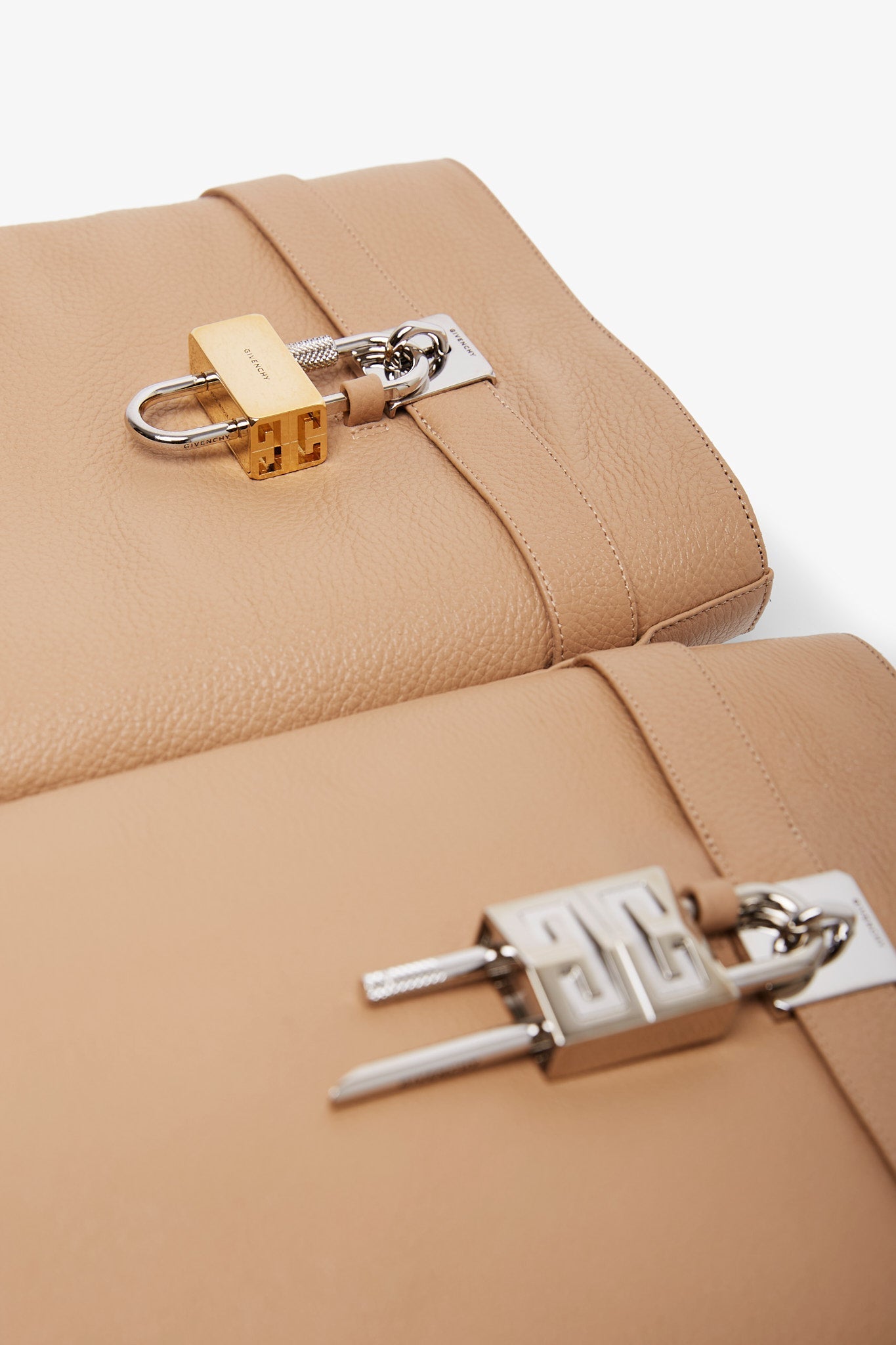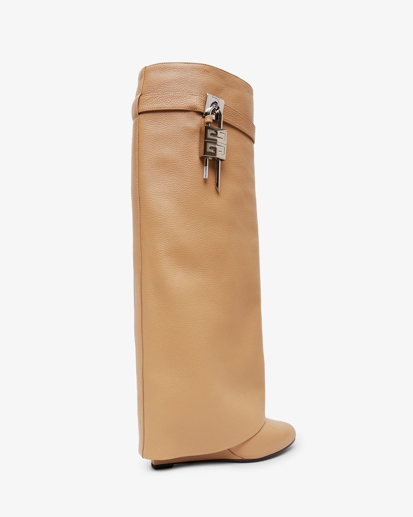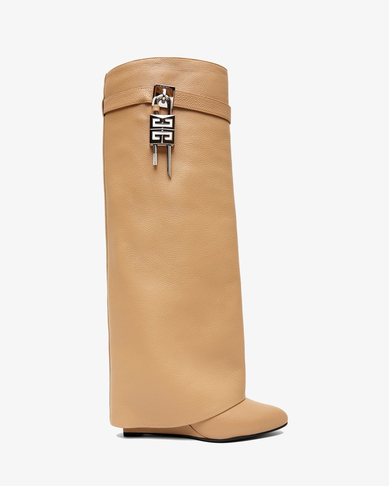Beige leather high-boots from Givenchy. The Shark lock boots are made in smooth calfskin leather in a classic fit, complete with a logo silver metal clasp and 4G padlock on the right side, and a gold and silver -finish logo padlock on the left. Set on a covered wedge heels measuring 90mm. Slips on.