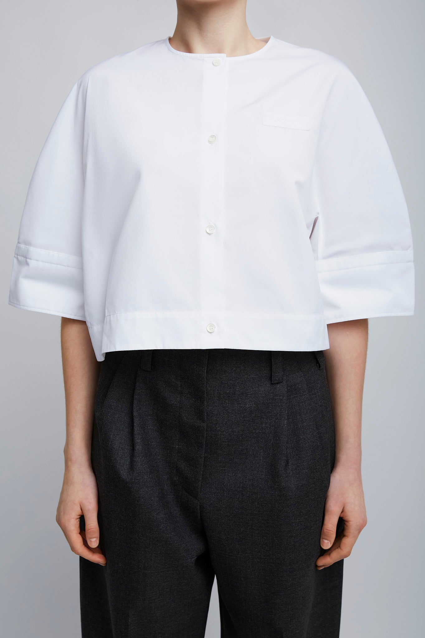 White cotton poplin short-sleeved shirt from Givenchy. The short-sleeved shirt is made in cotton poplin with button closure, crew neck and gros grain ribbon with printed logo on the chest.