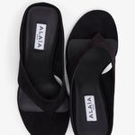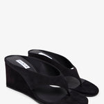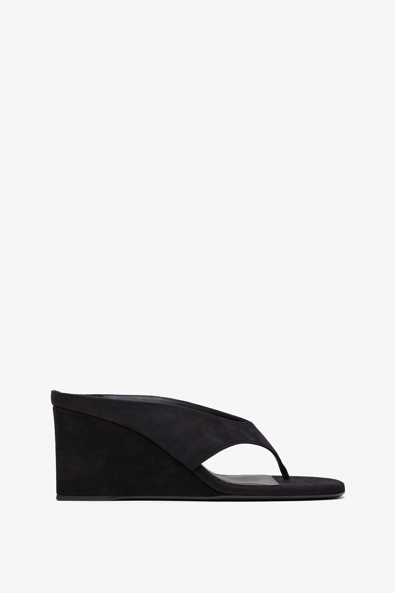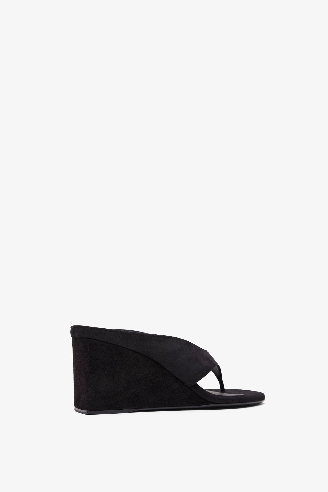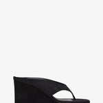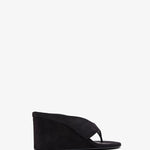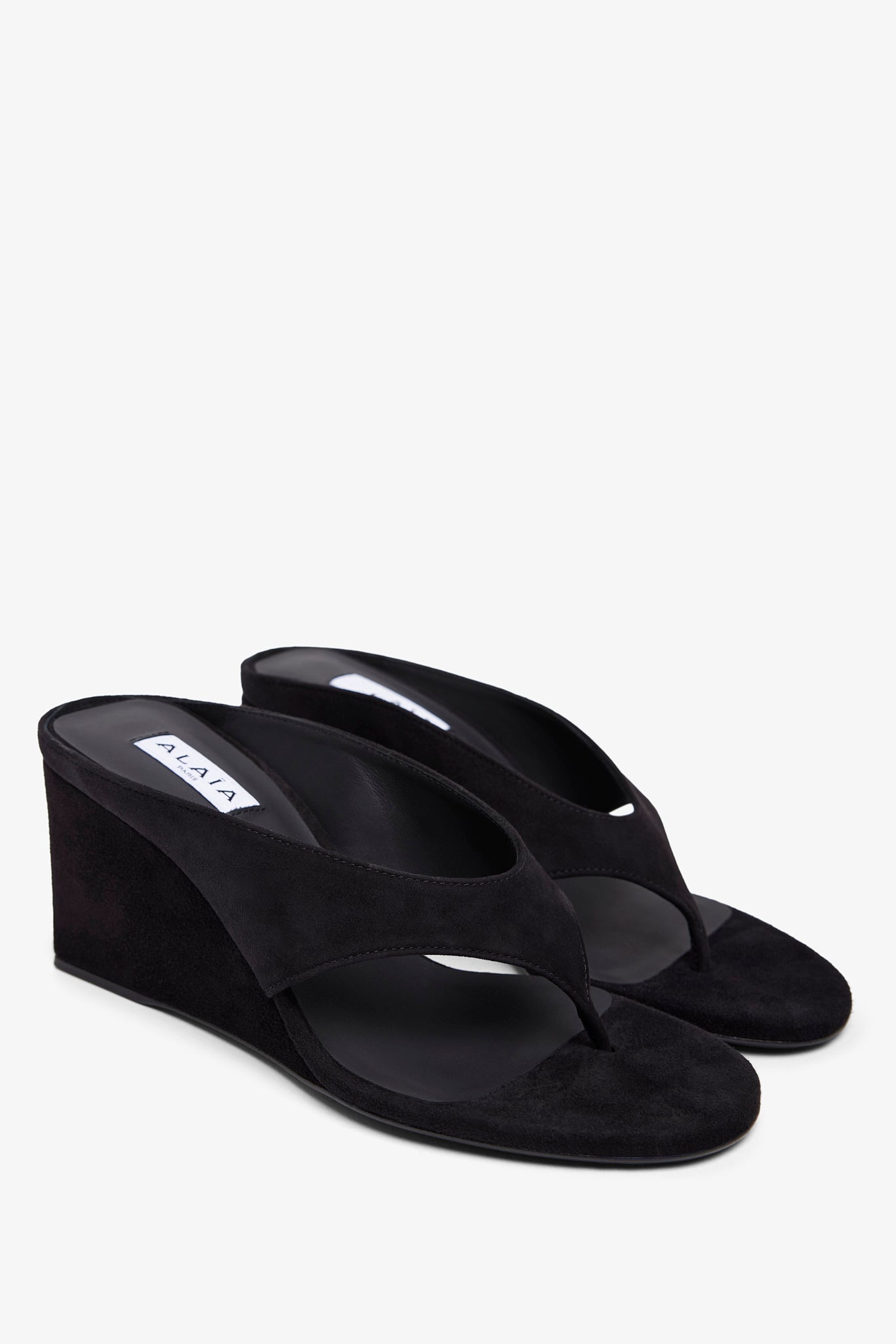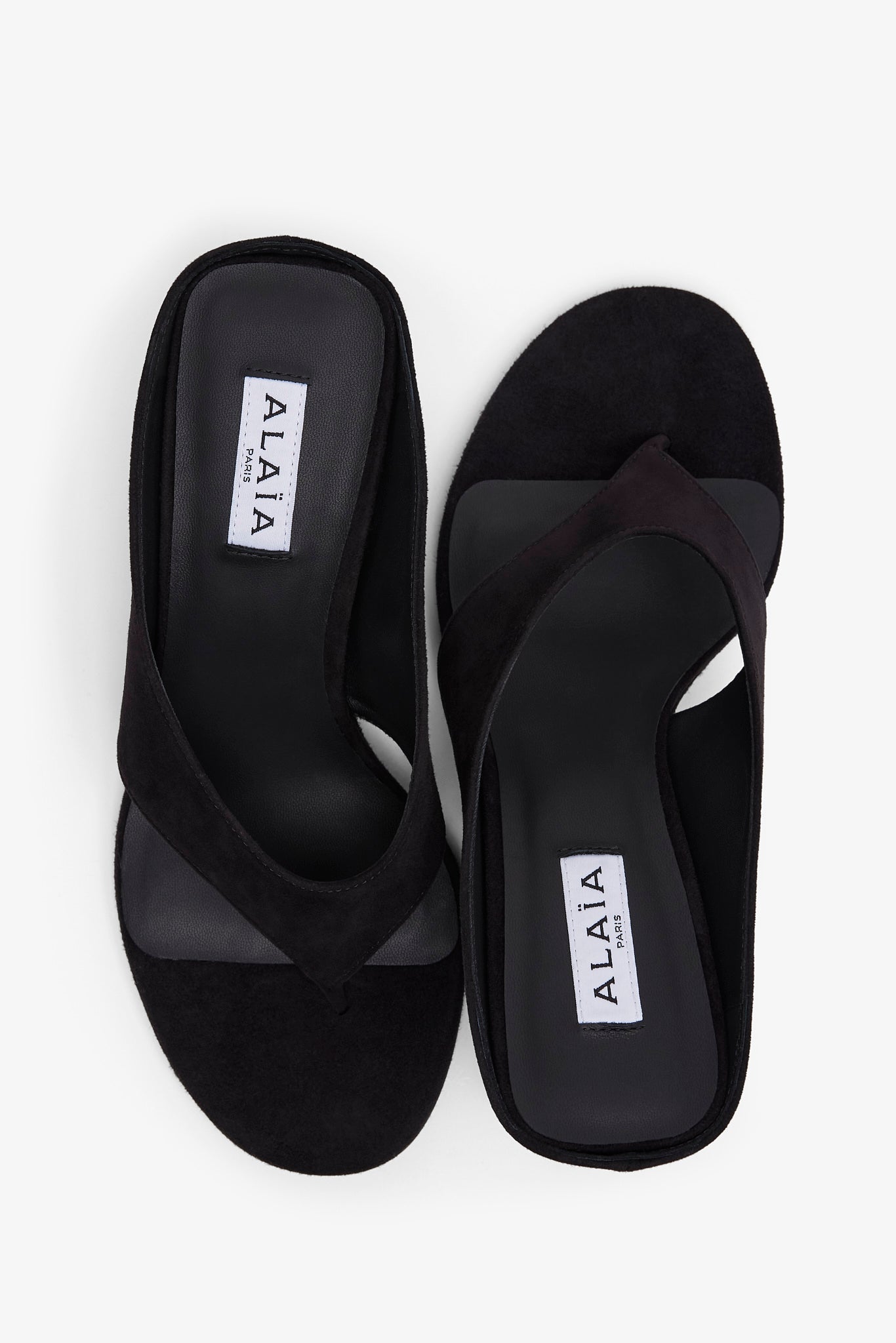 Black suede cube thong mules from Alaïa. The wedge thong mules are made from suede goatskin leather, feature a distinctive cubic heel measuring 75mm.