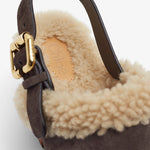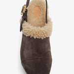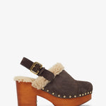 Brown shearling wedge clogs from Chloé. The Jeannette wedge clogs are made of suede calfskin and shearling, combining an adjustable ankle strap with a chunky wooden wedge platform. It is complete with gold-tone-studs and the Paddington buckle.