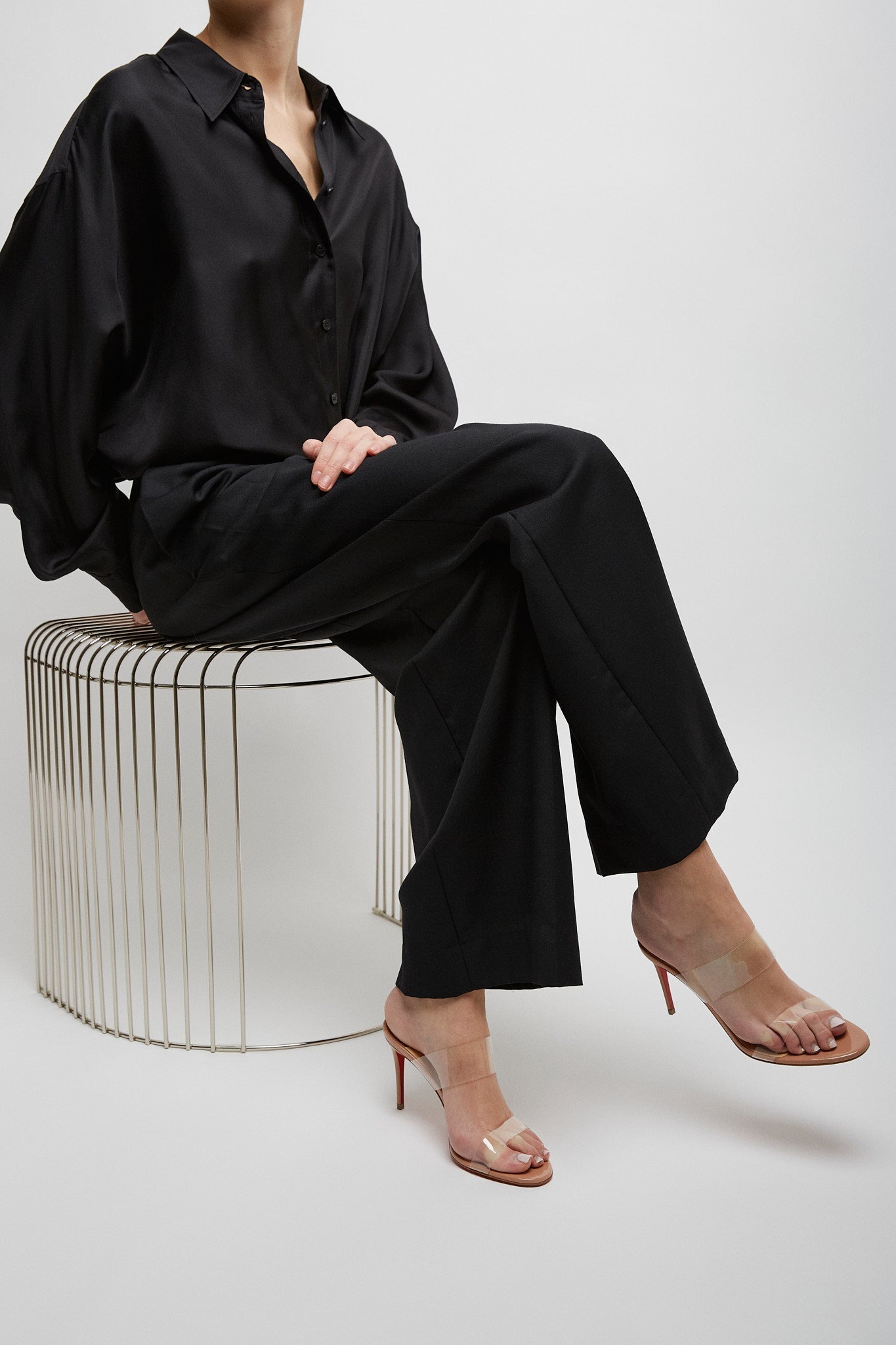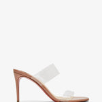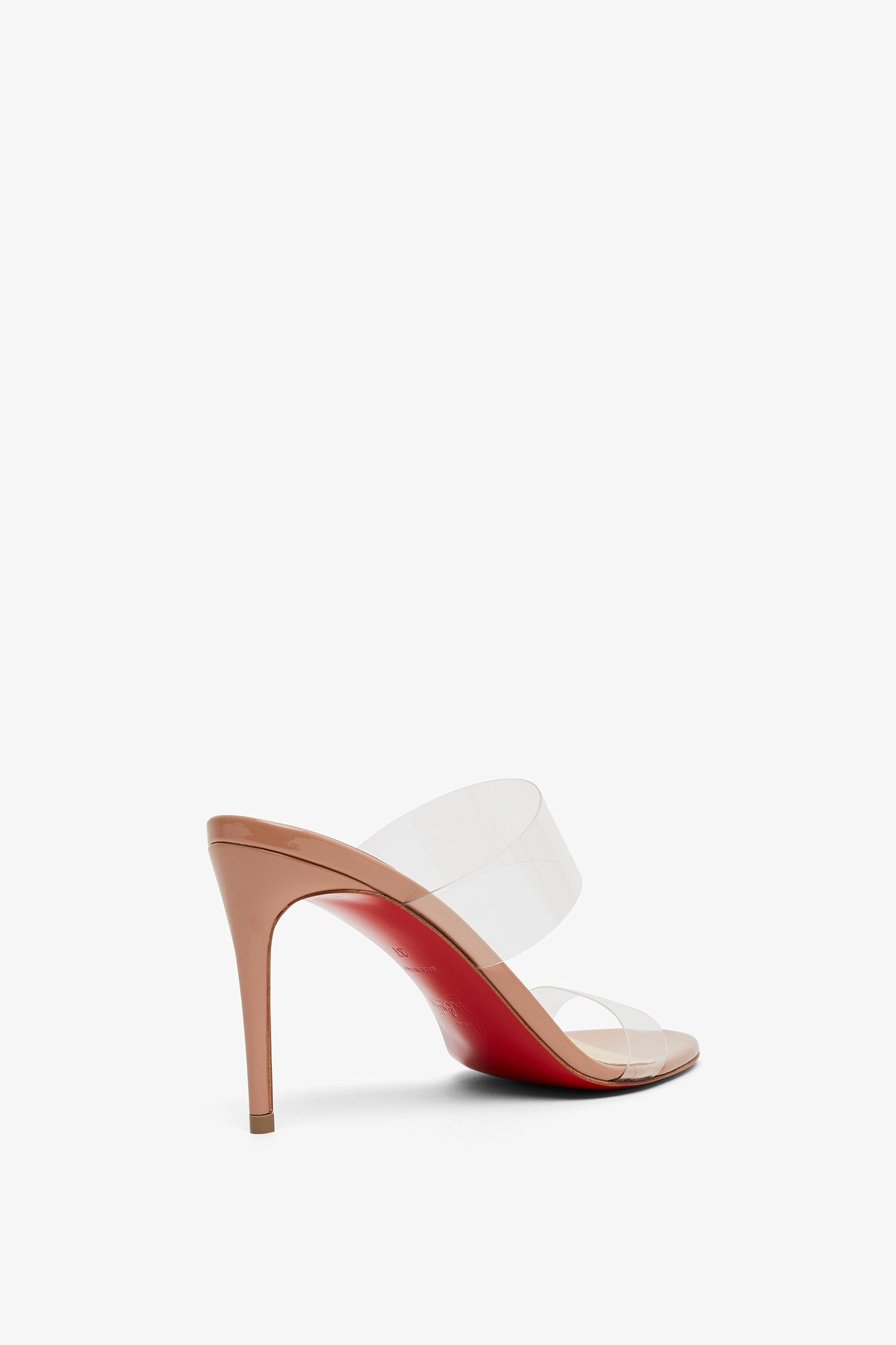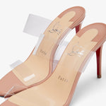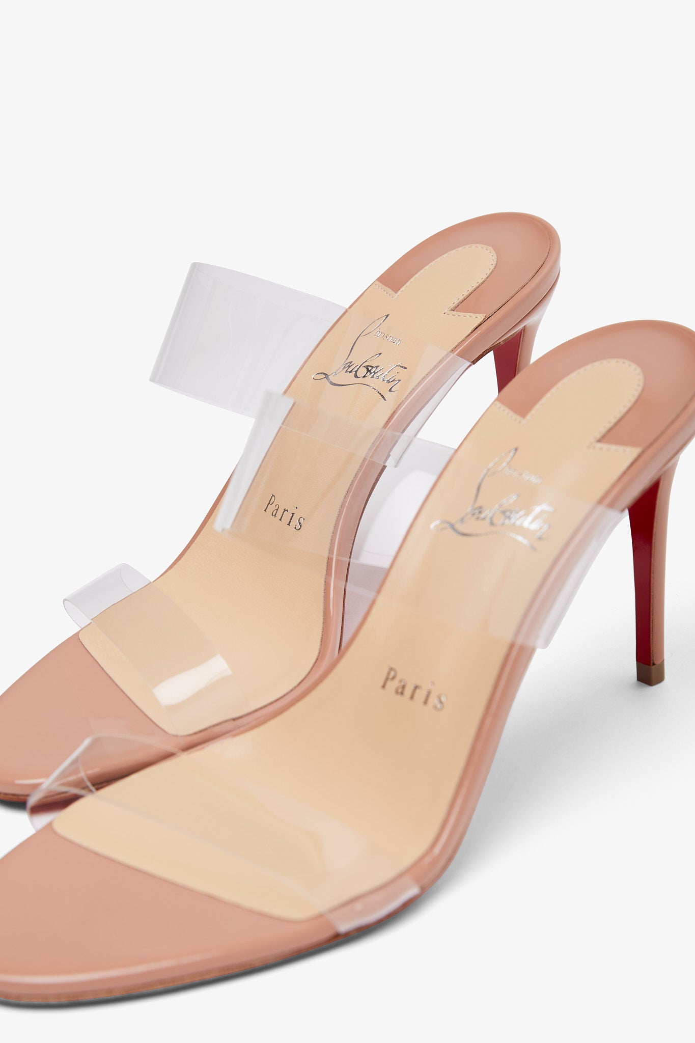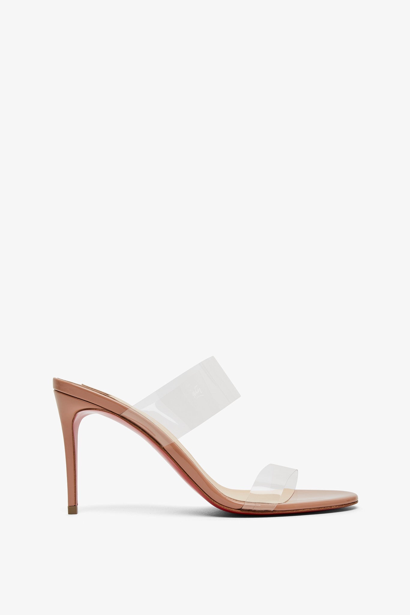 Patent blush leather and TPU sandals from Christian Louboutin. The Just Nothing sandals are made of patent blush leather with a transparent TPU upper, set on a stiletto heel measuring 85mm.
