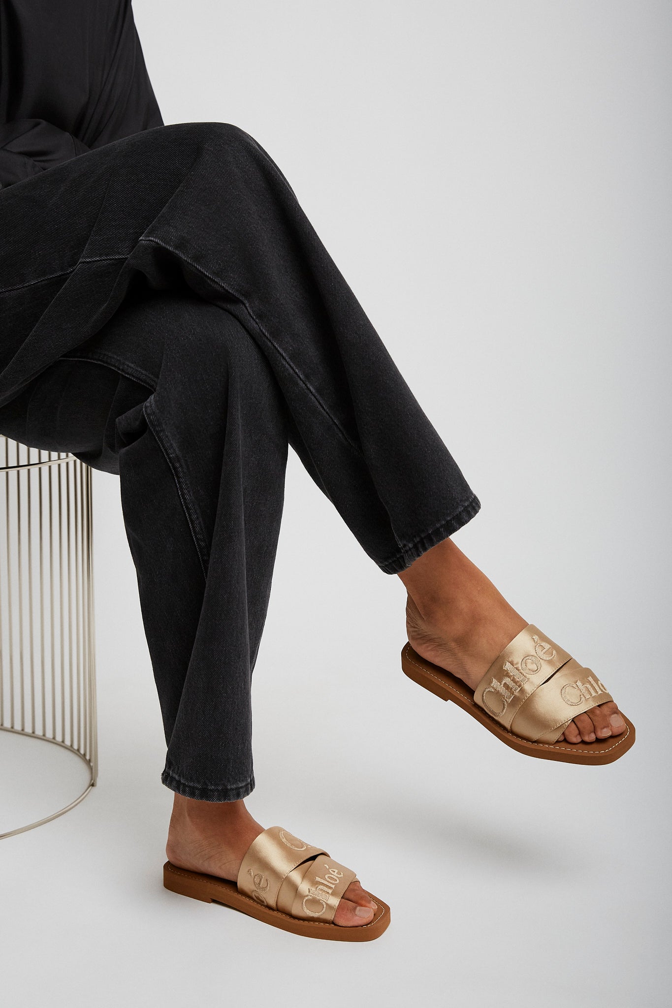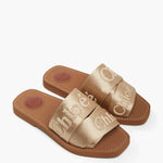 Light beige satin slides from Chloé. The Woody slides are made of different-sized ribbons with a tonal Chloé logo across the top, along with the designer's "O" signature on the inner sole. It is complete with ecru stitches on the rubber sole.