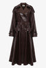 Brown coated linen coat from Chloé. The Double-breasted long riding coat in light coated linen with a check lining, featuring flap pockets, engraved horn buttons and a buckled belt finished with gold-tone D-rings.