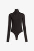 Black jersey bodysuit from Alaïa. The Heart jersey bodysuit is made in fluid jersey with a signature heart-shape cut out in the back, a high neck and long sleeves.