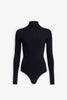 Black ribbed knit bodysuit from Alaïa. The bodysuit is made in a sculpting ribbed knit with a high neck, long sleeves and classic briefs.