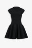 Black skater dress from Alaïa. The Skater mini dress is made in a compact viscose knit featuring cap sleeves, straight neckline, fitted bust and flare skater skirt.