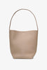 Taupe grained leather bag from The Row. The Medium N/S Park tote bag is made of grained calfskin leather featuring an interior toggle closure and flat handles, complete with a suede lining.