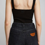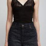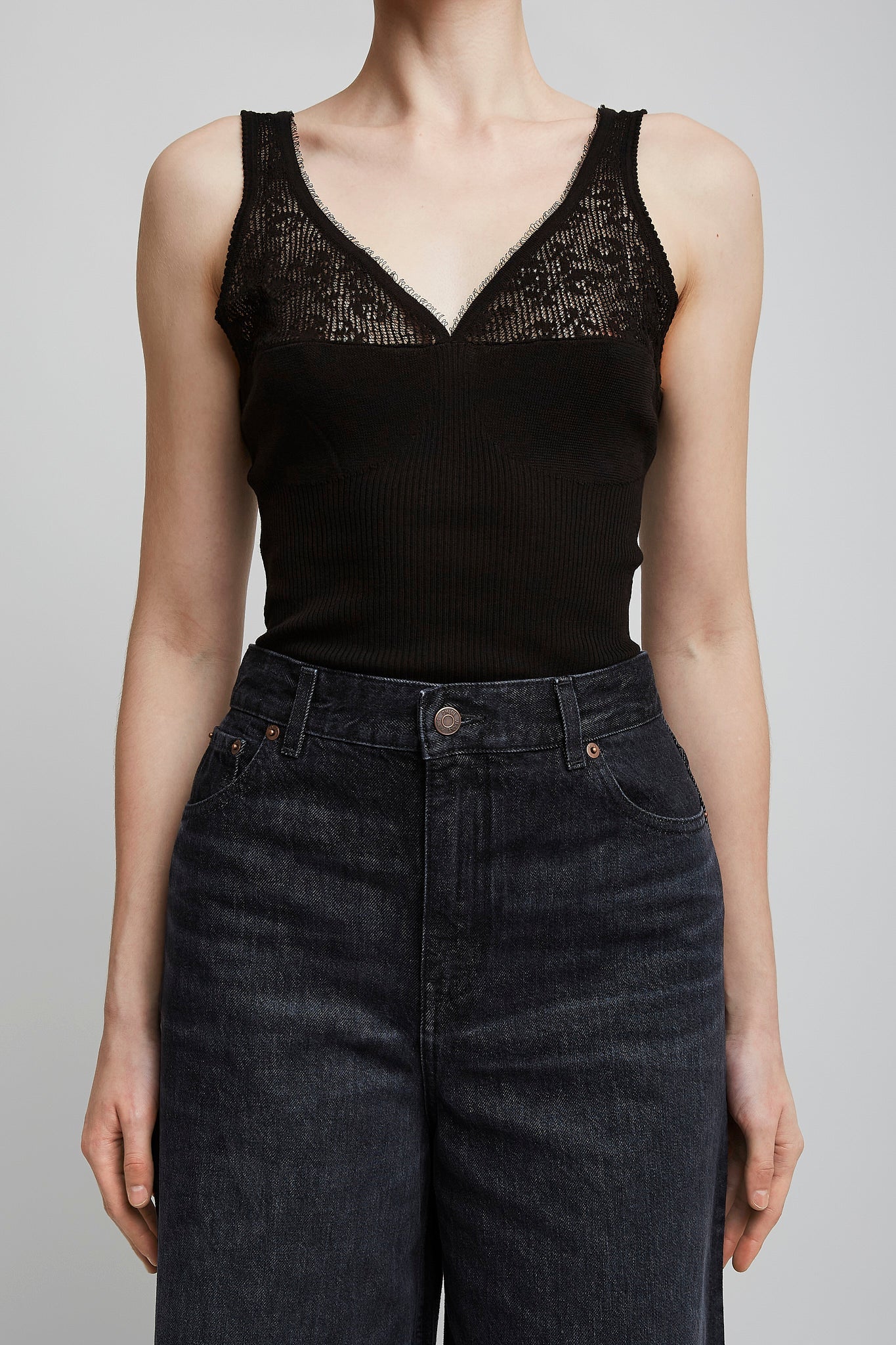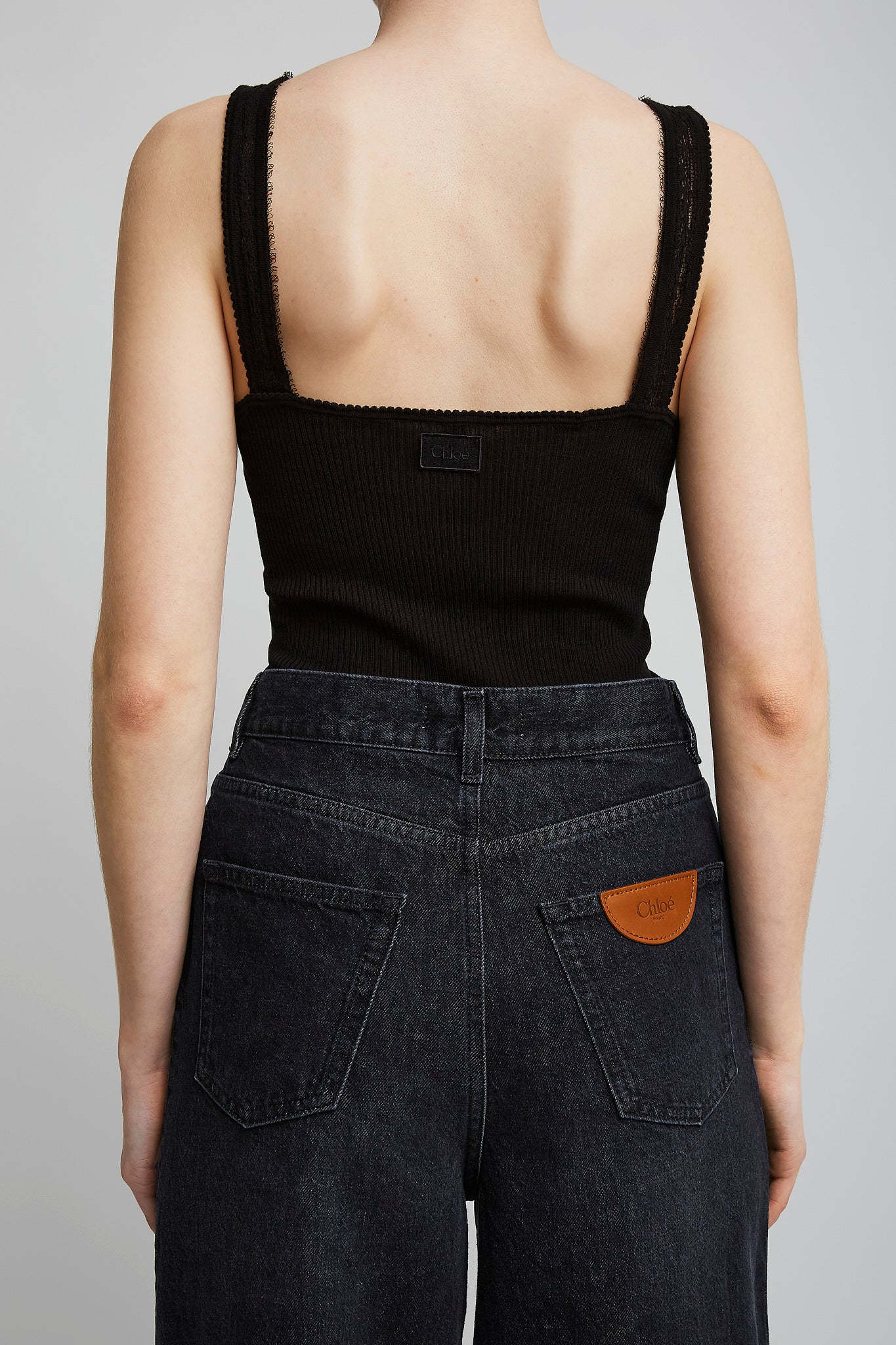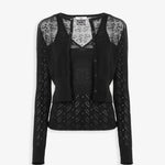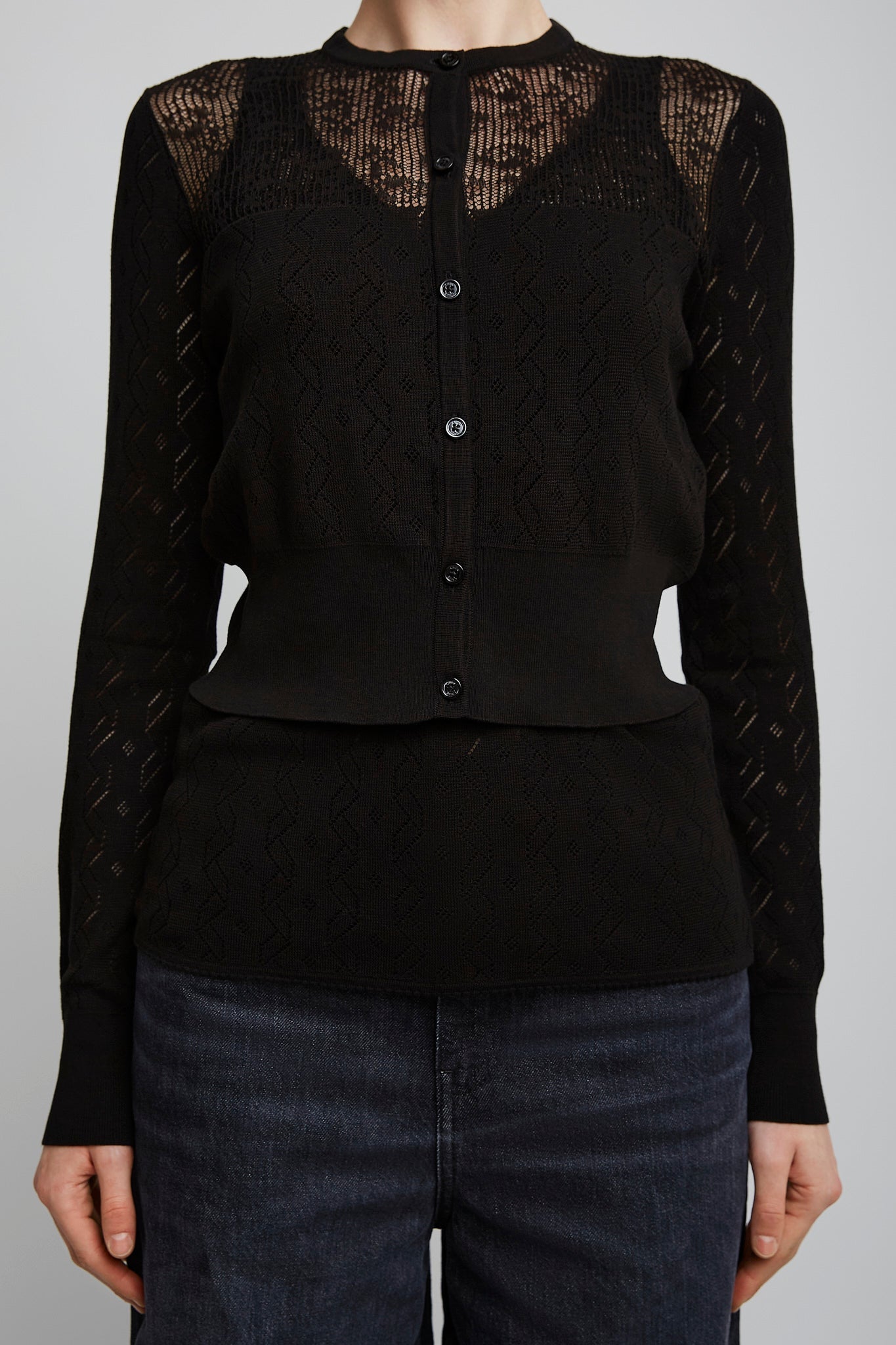 Black knitted top from Chloé. The Black knitted top is made in a cotton pointelle knit with lace-effect stitches and ribbed trims. It has mother-of-pearl buttons and a Chloé logo patch at the back.