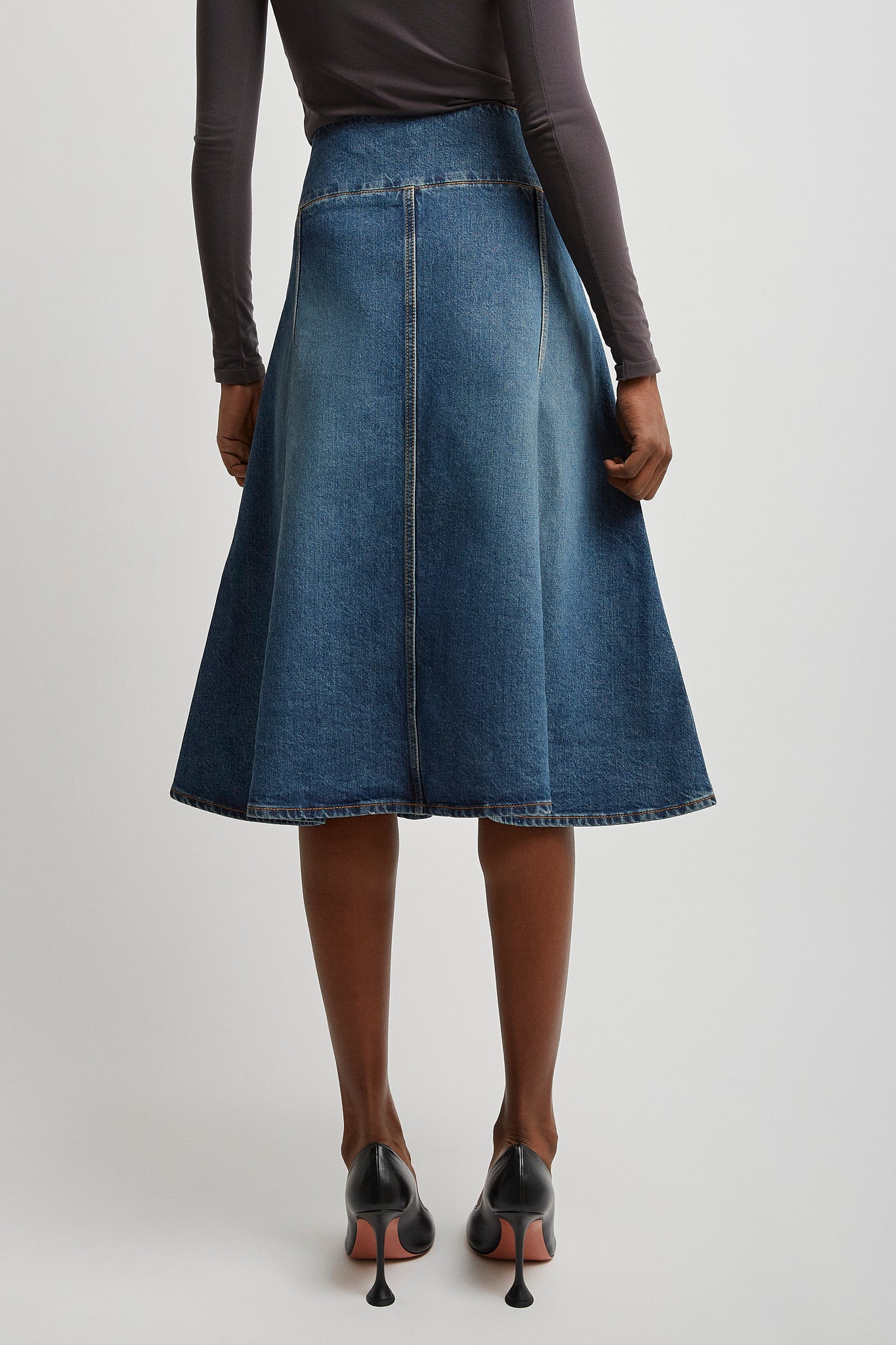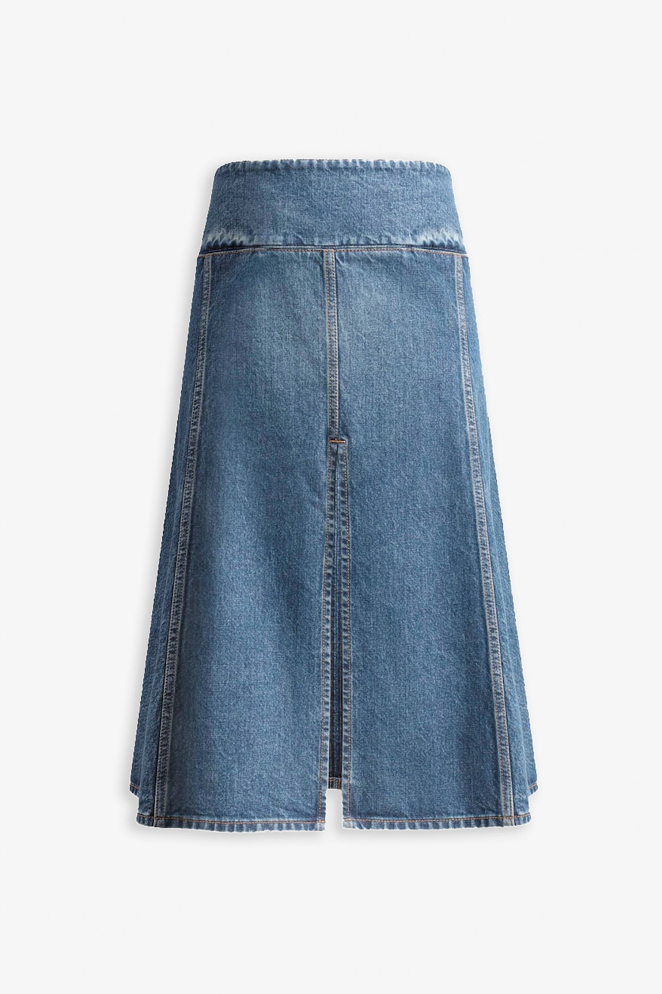 Blue denim skirt from Alaïa. The Slit skirt has an A-line cut and is made in vintage effect washed denim with a low waist, mid-length and front seam pockets.
