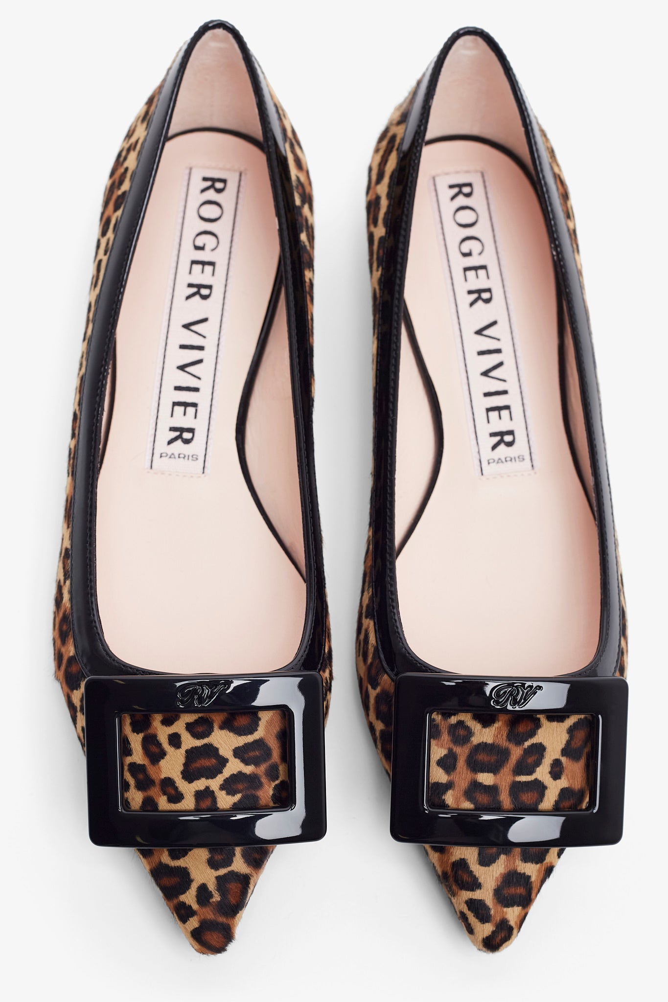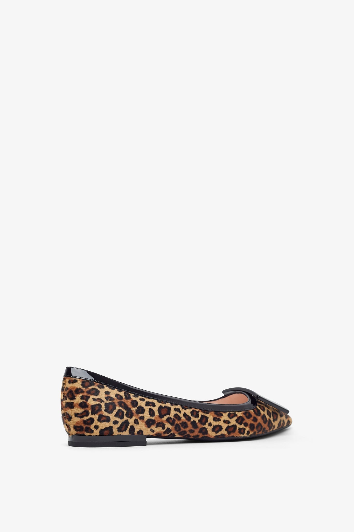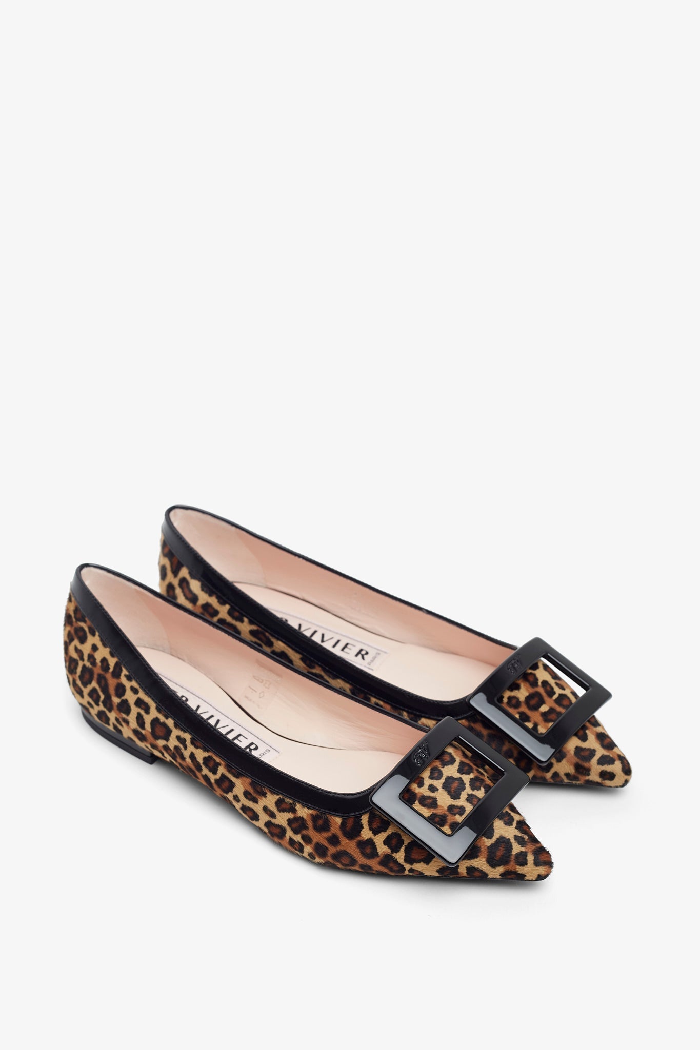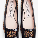 Black and brown leopard ballet flats from Roger Vivier. The Gommettine ballet flats are made of patent leather featuring a black patent leather buckle and pointed toes.
