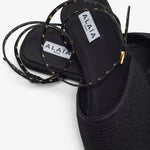 Black flat paper straw sandals from Alaïa. The Paper straw sandals are cut from paper straw pannels that are artisanally weaved and assembled together, with an ankle leather eyelet strap, set on a rubber sole.