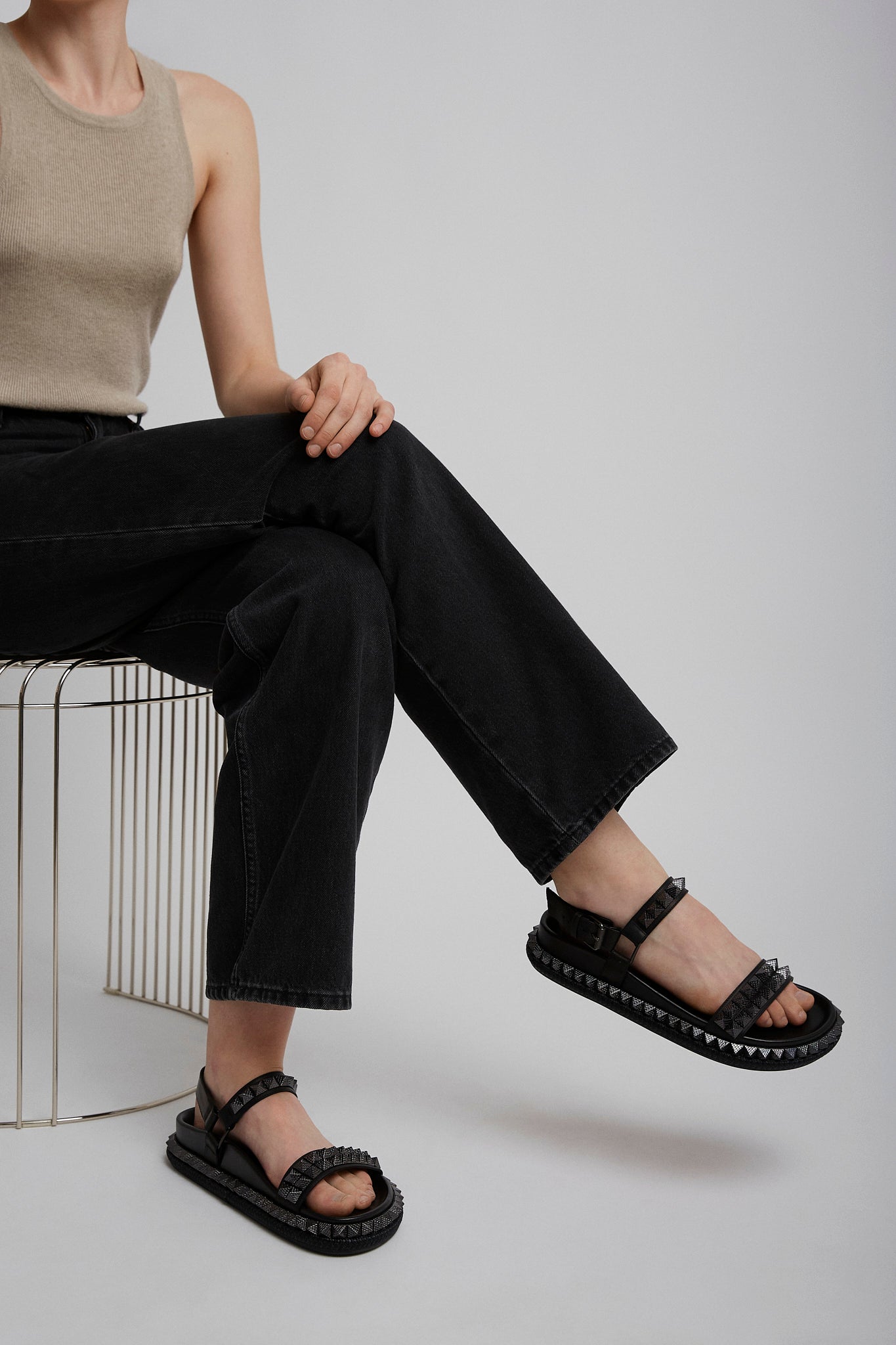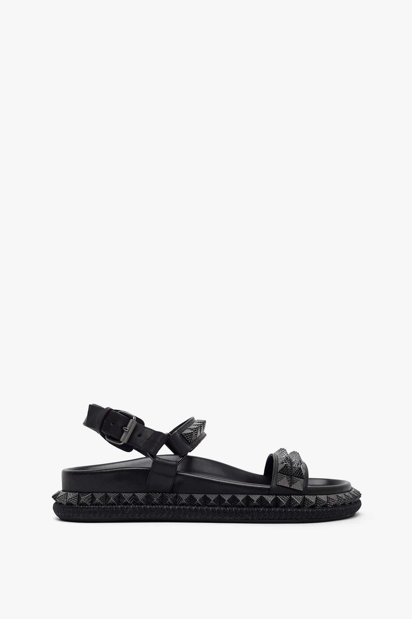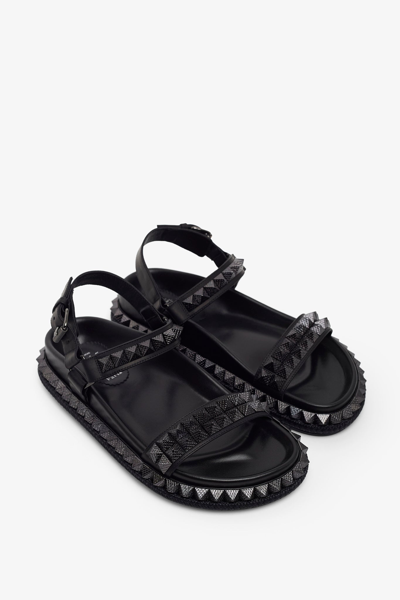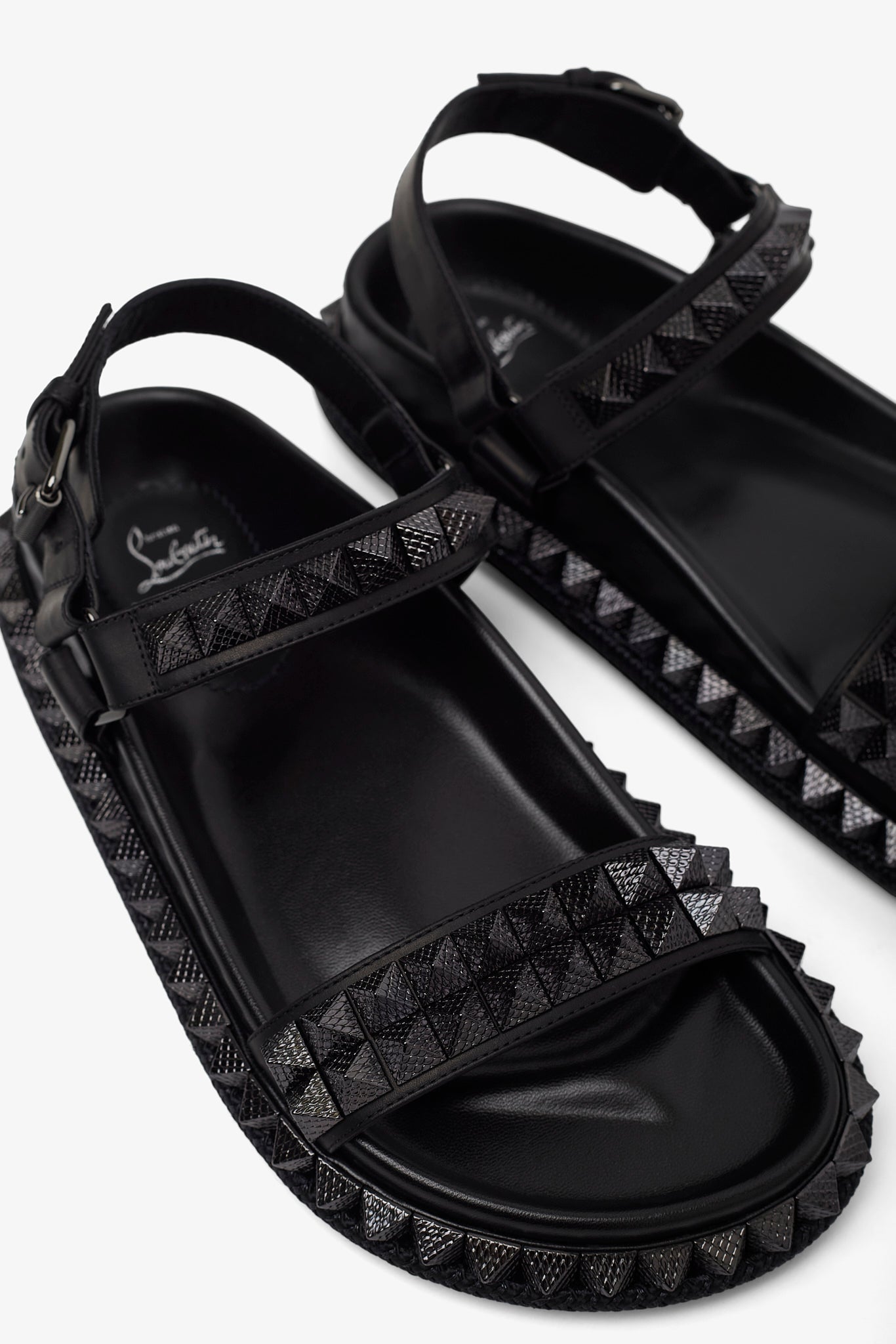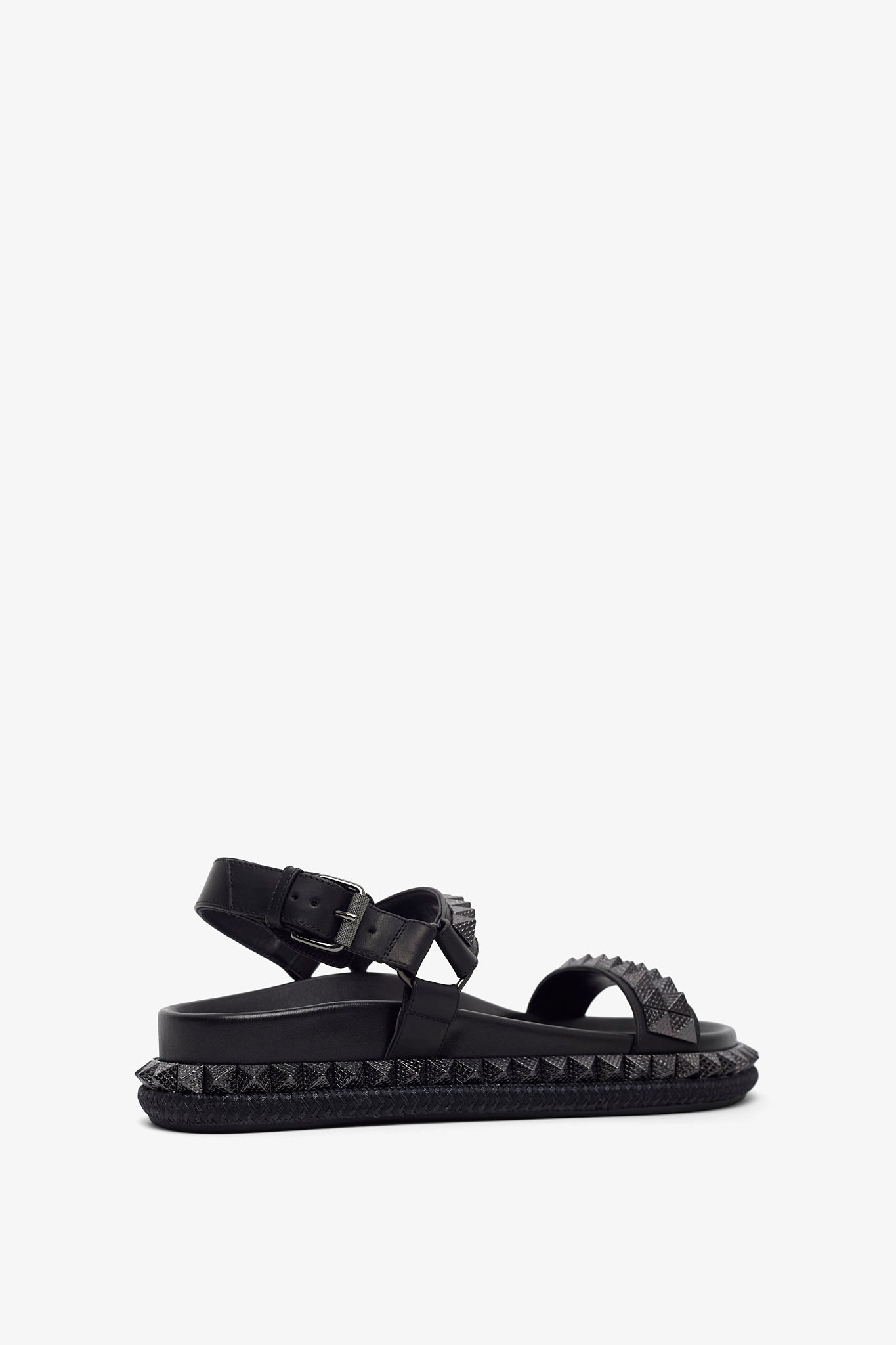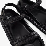 Black leather sandals from Christian Louboutin. The Pyrabizz sandals are made of waxed calf leather, trimmed with tonal pyramid-shaped spikes on the sole and straps. It fastens with an adjustable heel strap complete with a tonal buckle.