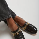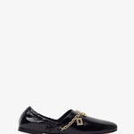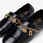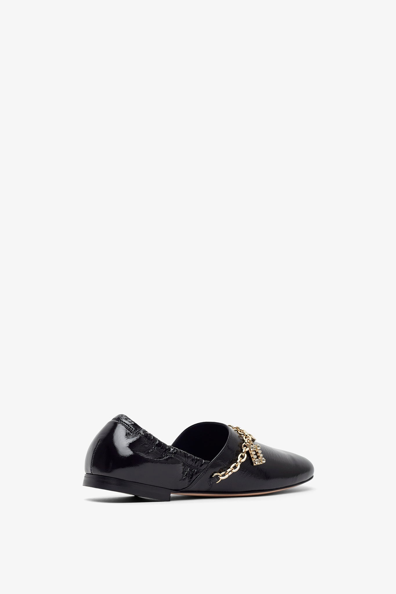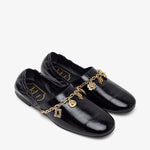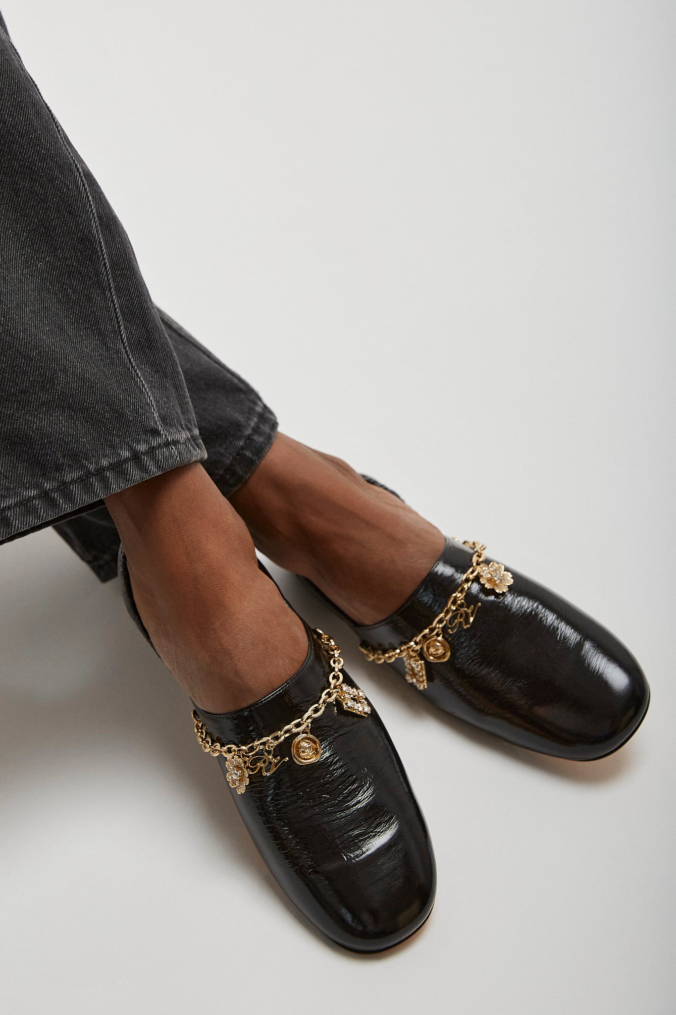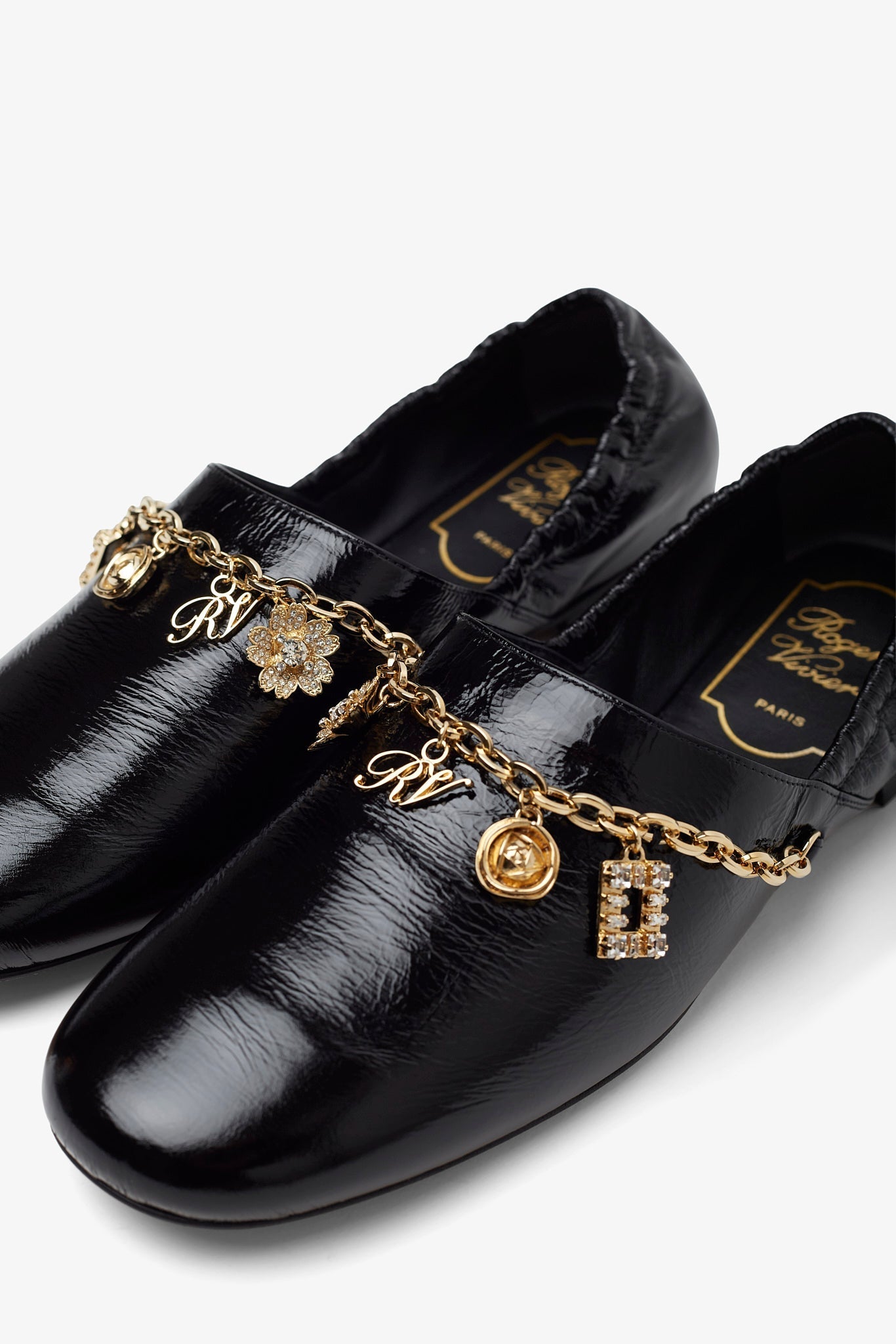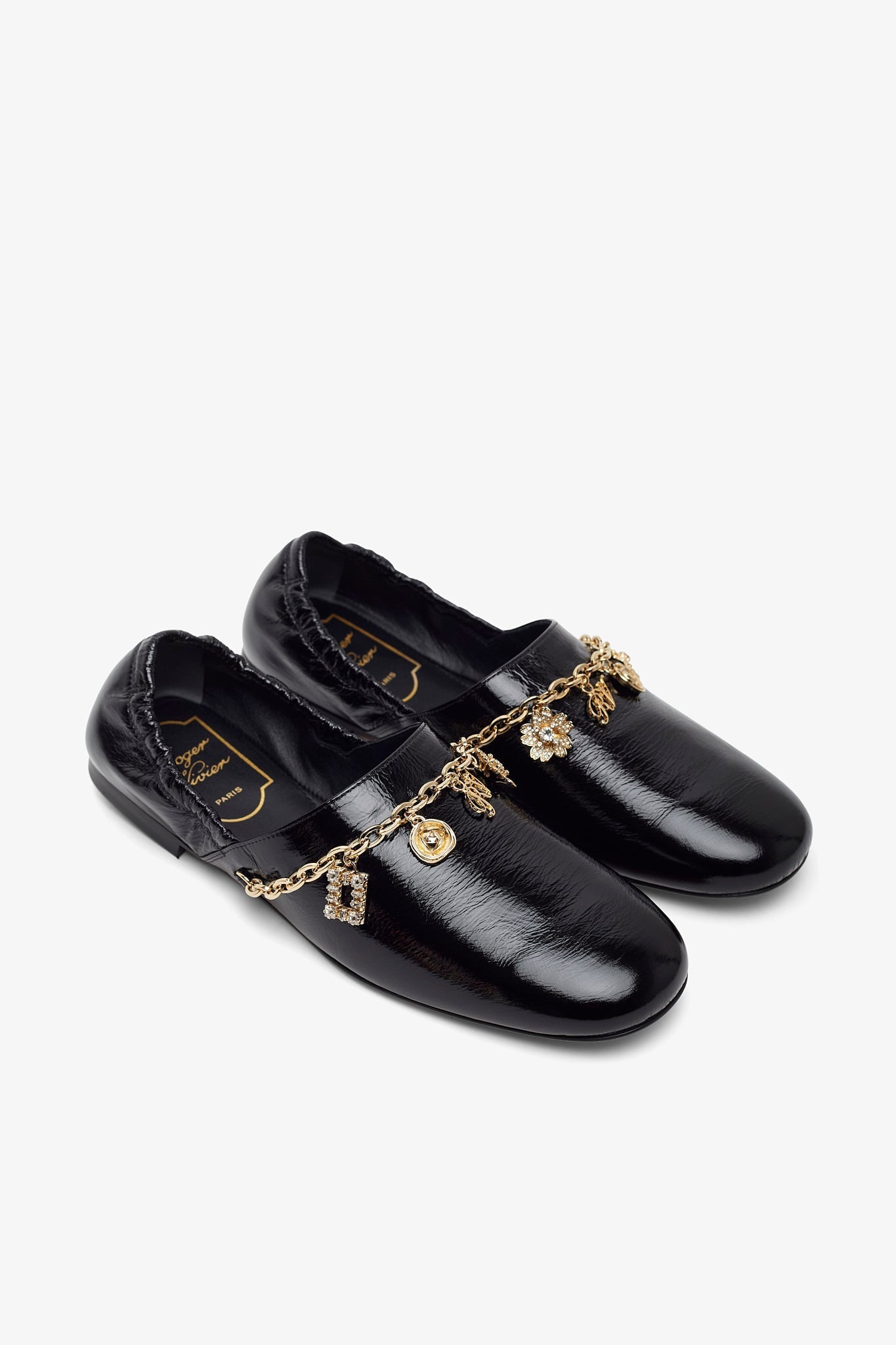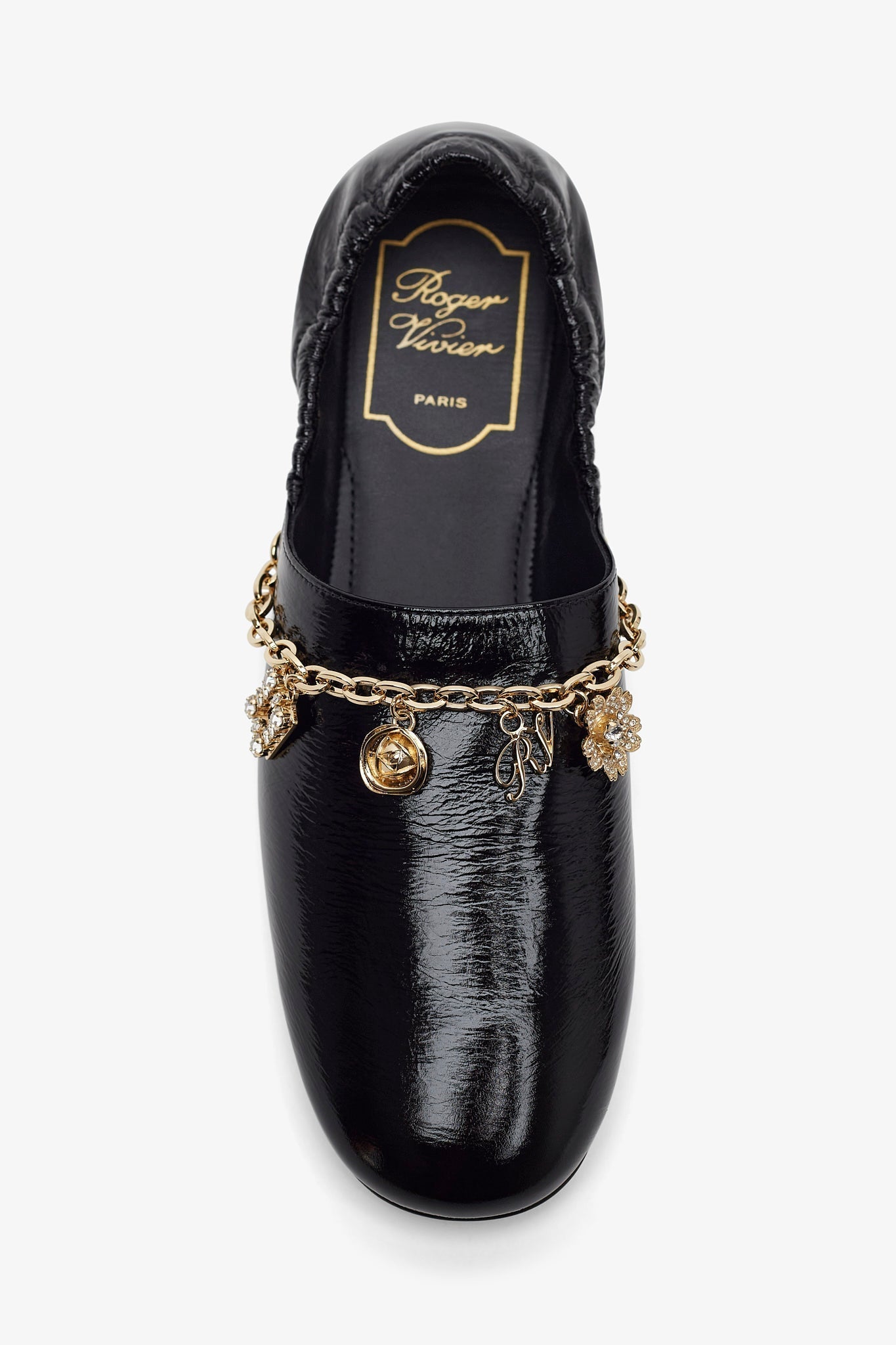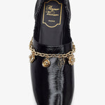 Black patent leather slippers from Roger Vivier. The Roundytoe slippers are made in patent calfskin leather featuring a front chain with charms and crystal detailing along with elastic piping.