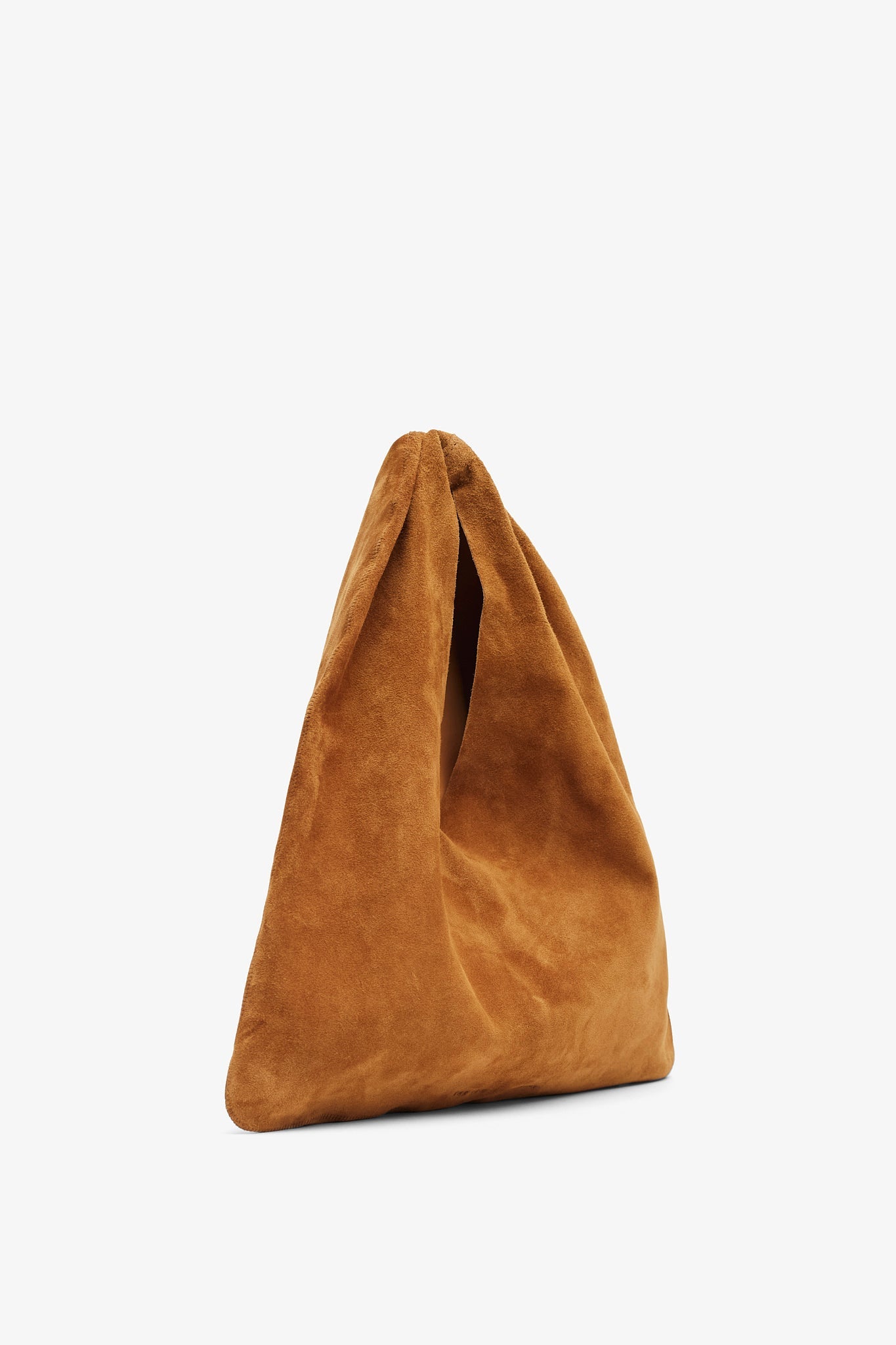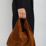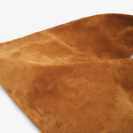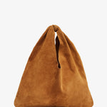 Brown suede top handle bag from The Row. The Bindle shoulder bag is made in soft suede with a single seam, draped handle, and single interior pocket.