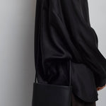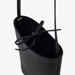Black leather crossbody bag from The Row. The N/S crossbody bag is made in textured calfskin leather with adjustable shoulder strap and folded base. It is minimally finished, the natural grain surface is left intact, giving the leather a supple hand and refined texture that develops character over time.
