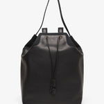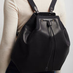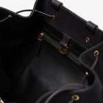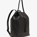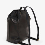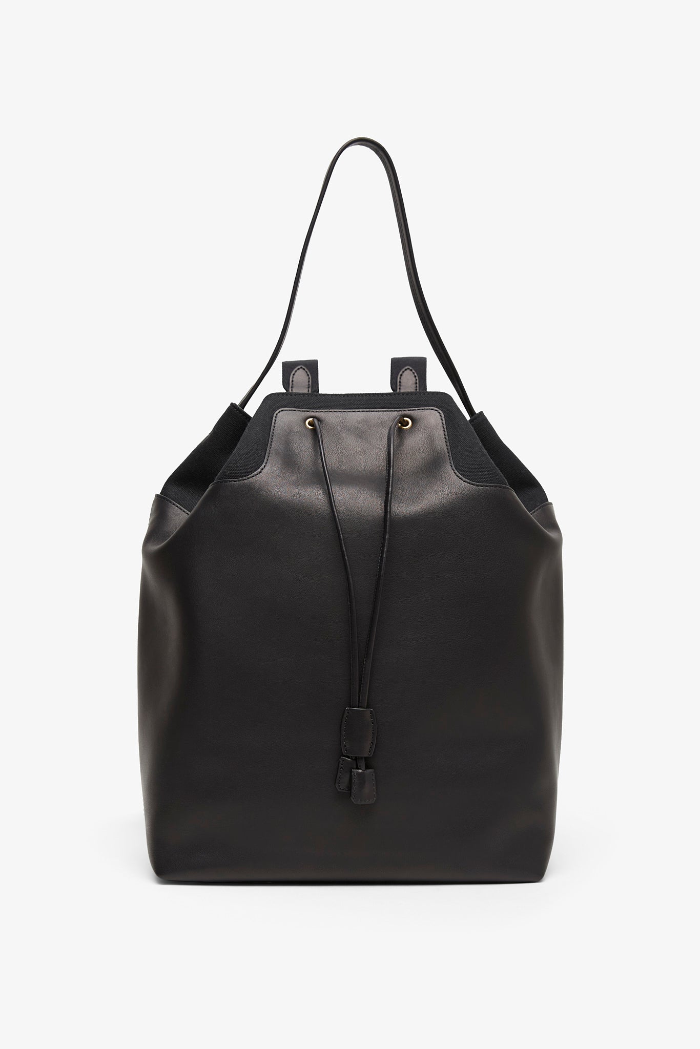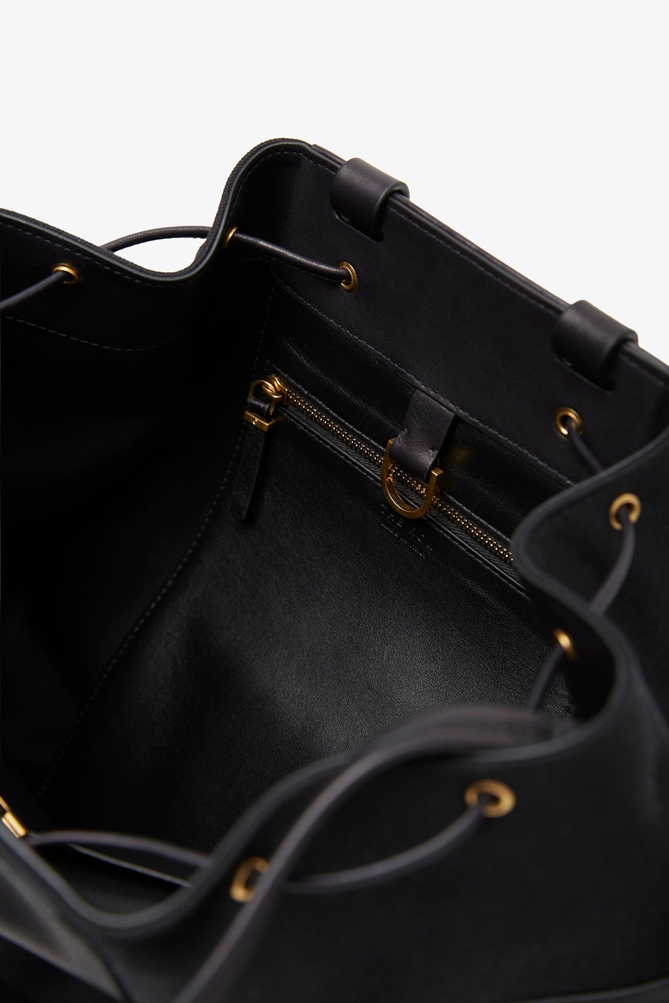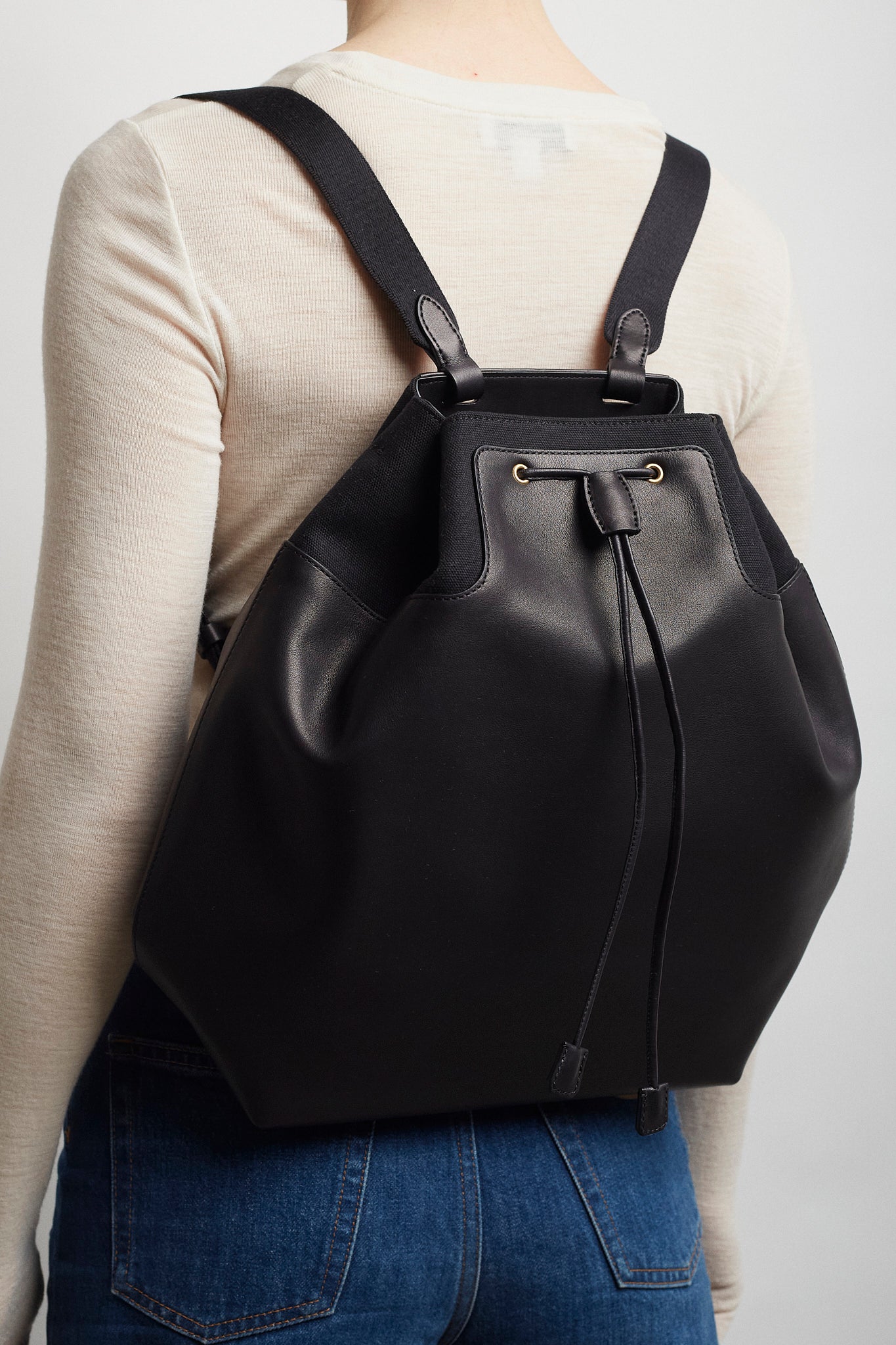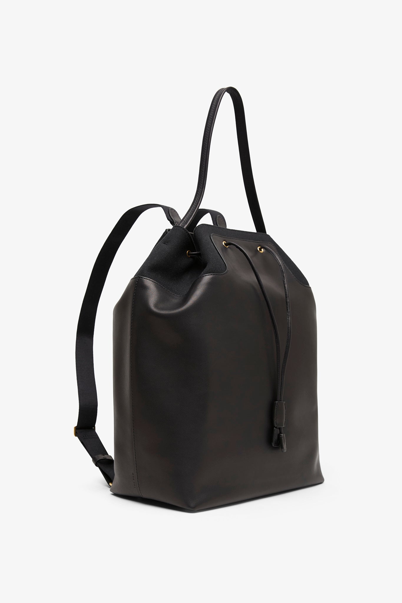 Black leather backpack from The Row. The Spring backpack is made of smooth saddle leather with tonal canvas top panel, adjustable shoulder straps, and drawstring closure.