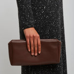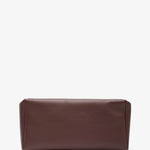 Brown leather clutch bag from The Row. The Squared Compact clutch bag is made in smooth nappa leather with a gently folded top, gusseted side panels, and zipper closure.