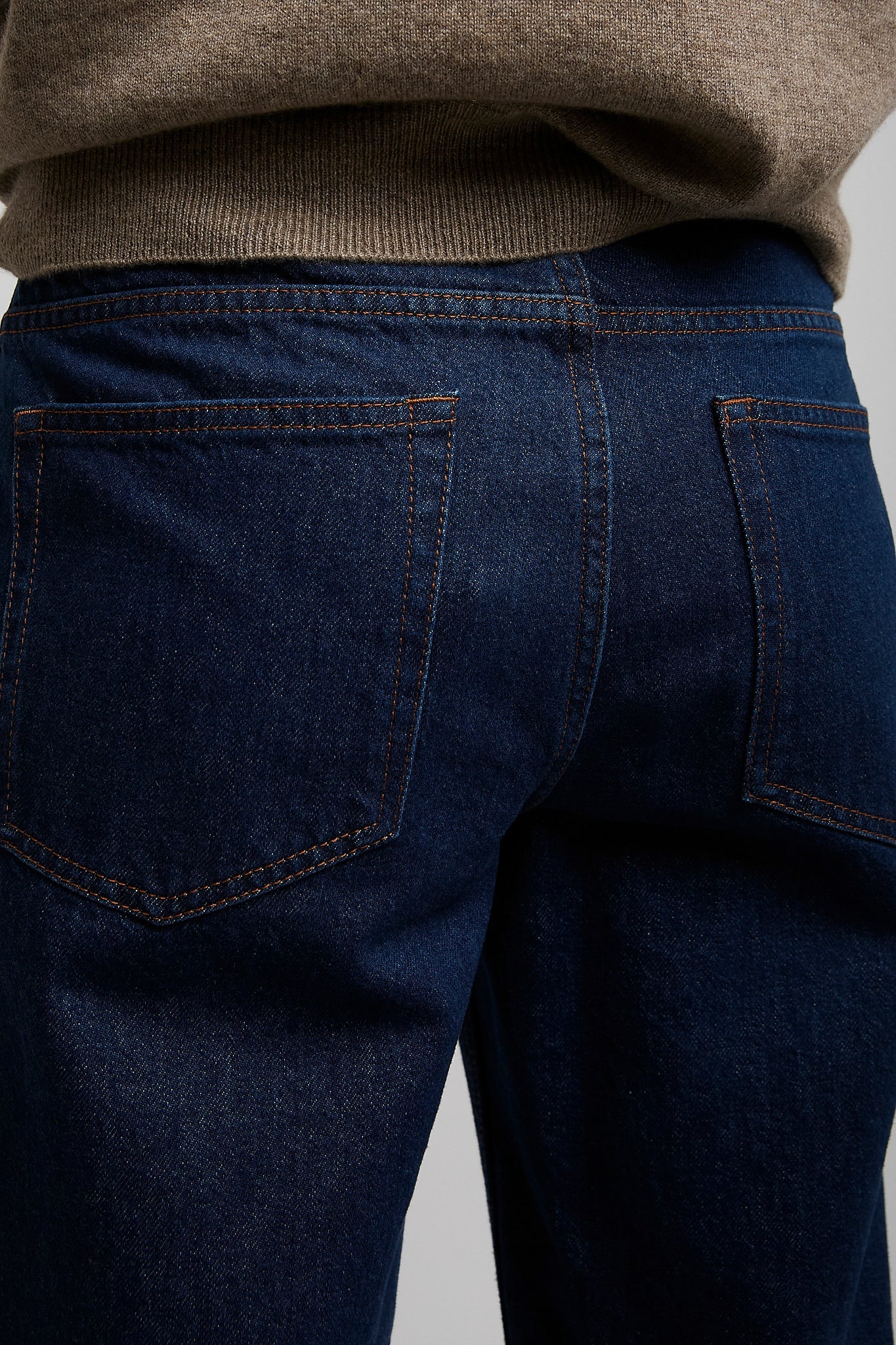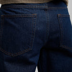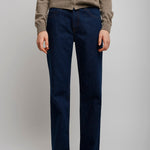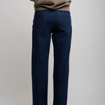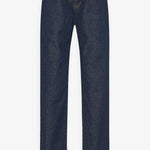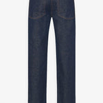 Dark blue jeans from The Row. The Carlyl straight leg jeans are made in Japanese Supima cotton denim with contrast topstitching and classic 5-pocket construction.