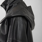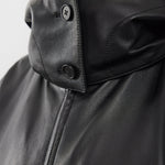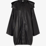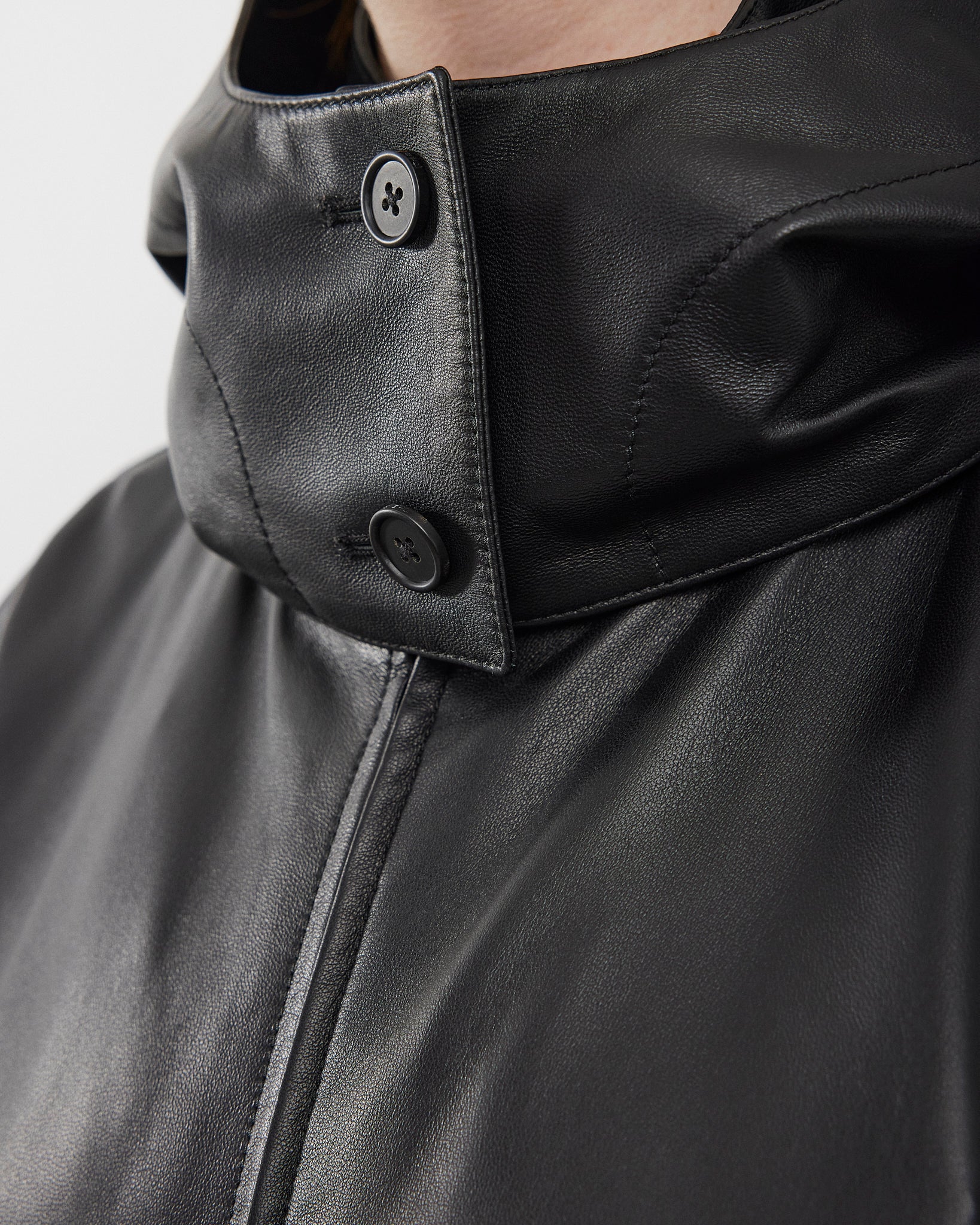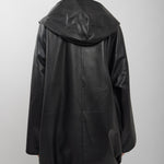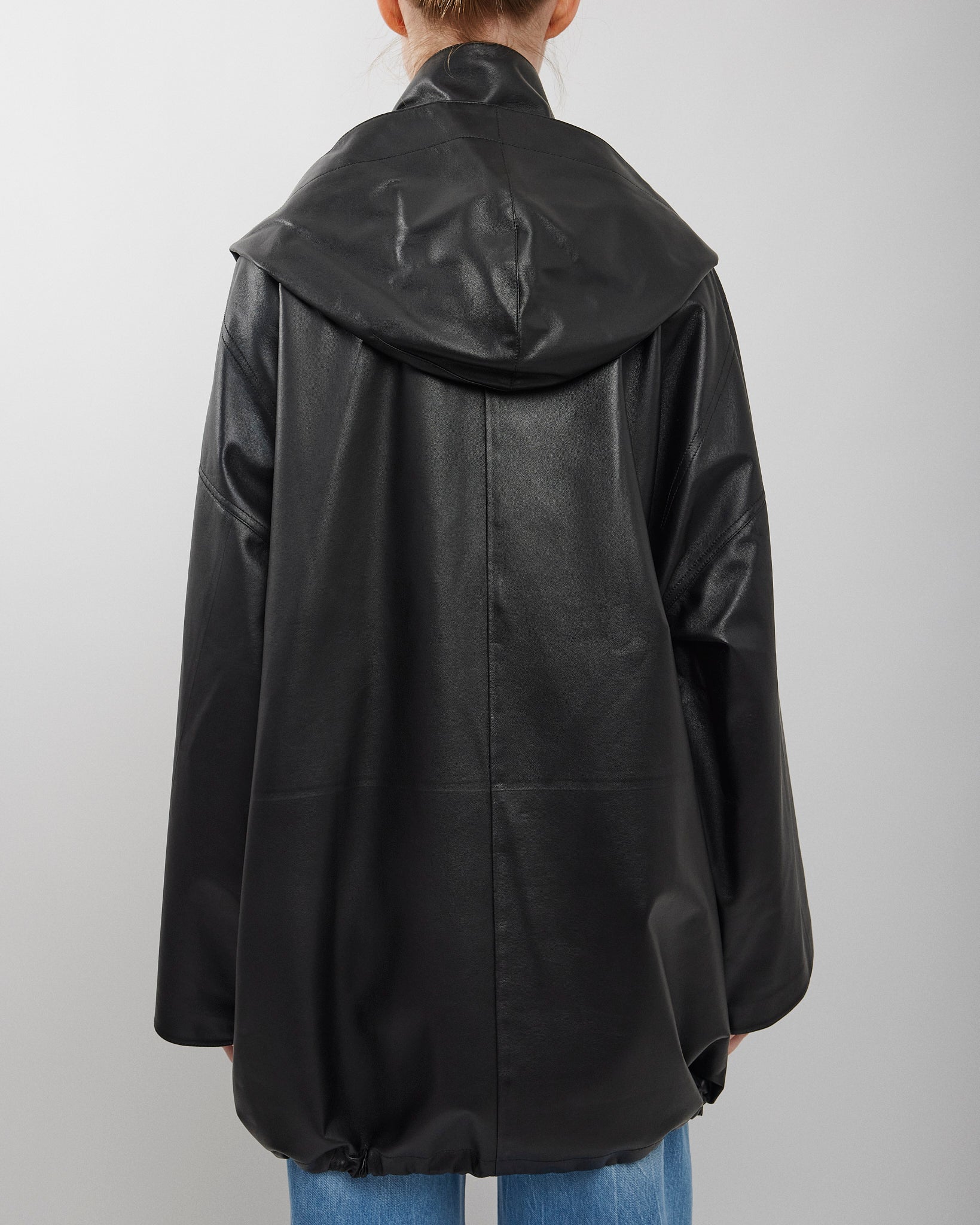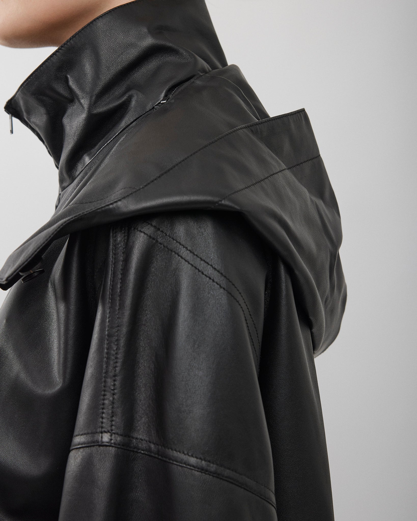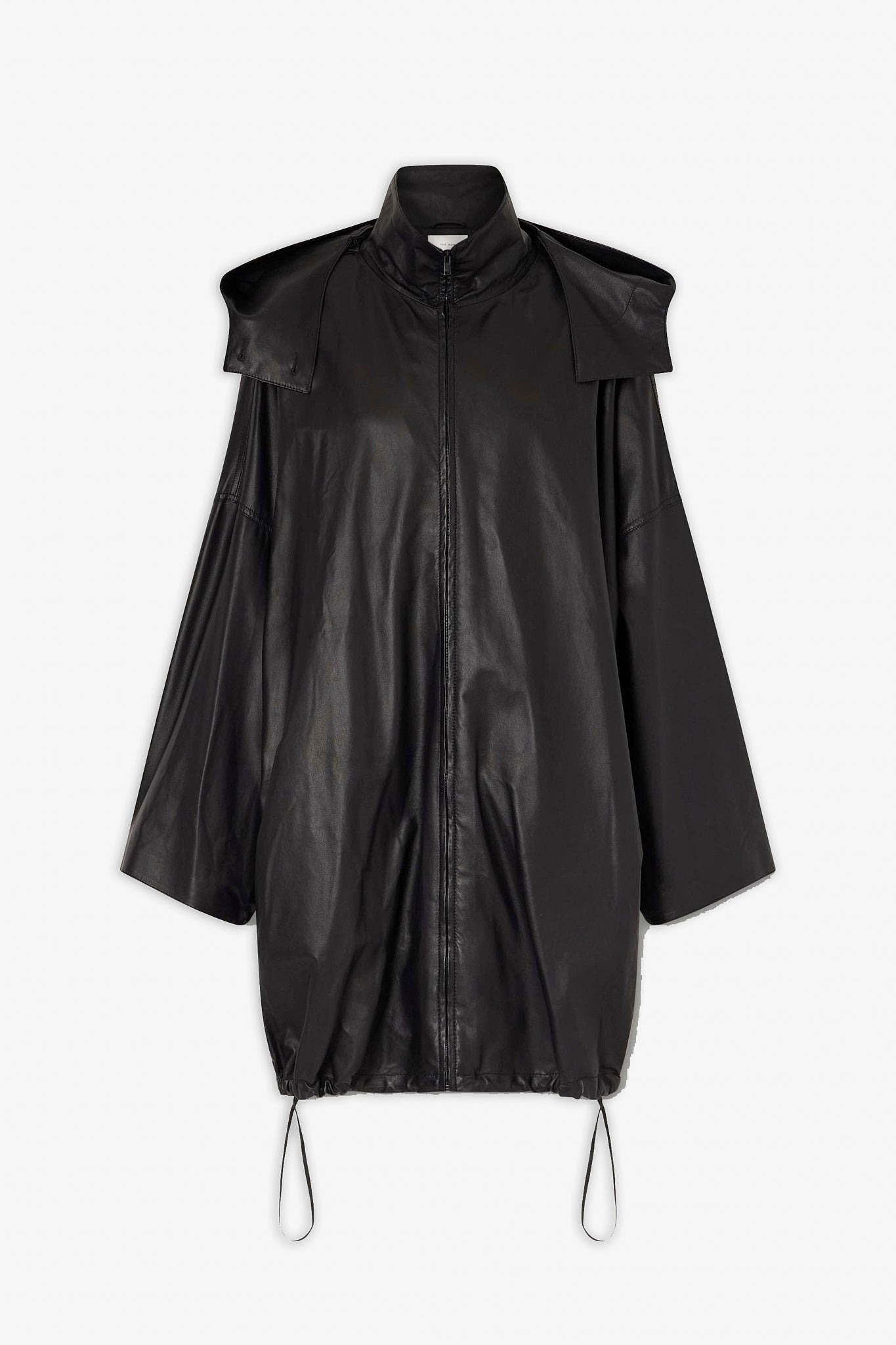 Black leather coat from The Row. The Cassandre coat is crafted from supple leather, finished with a detachable hood and a drawstring hem. Features a zipped front closure, drawstring at the hem for adjustable fit, and welt pockets.