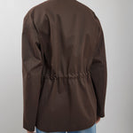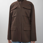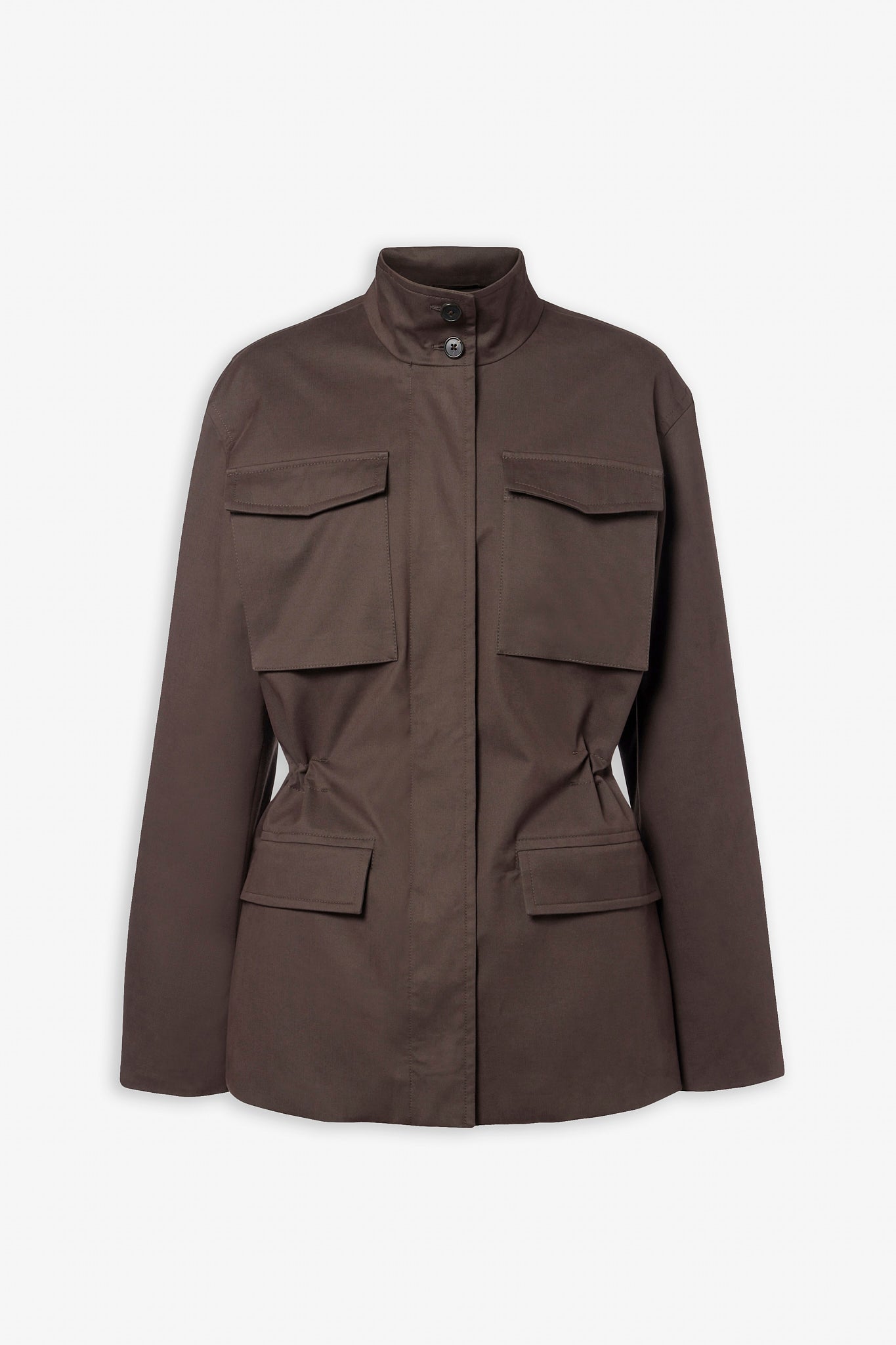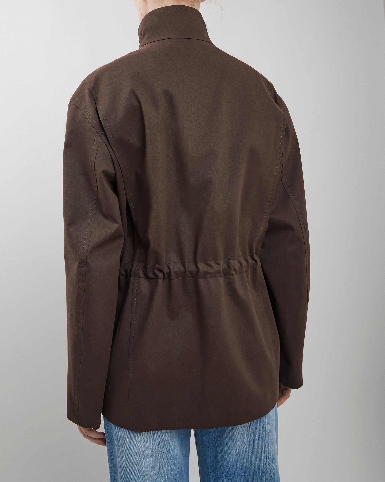 Chestnut brown field jacket from The Row. The Floriane field jacket is made from cotton with a touch of cashmere, featuring a high neck and large, functional pockets. Features concealed zipped front closure, horn buttons and a drawstring waist.