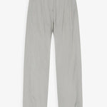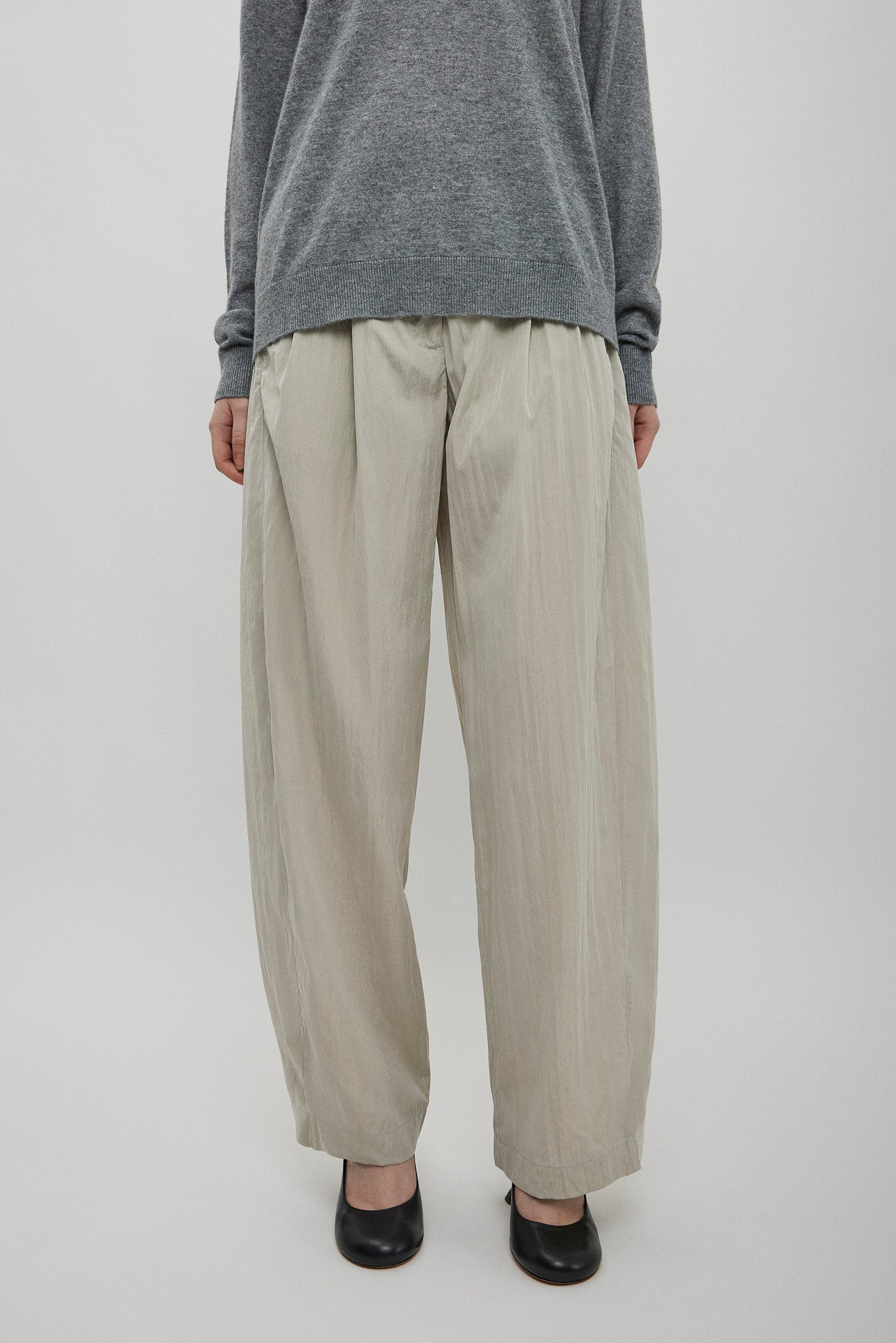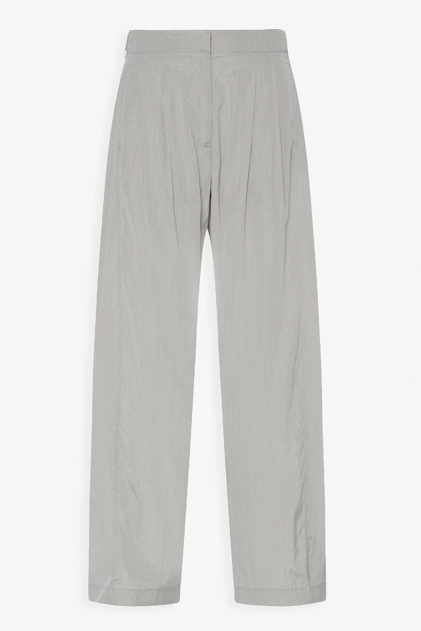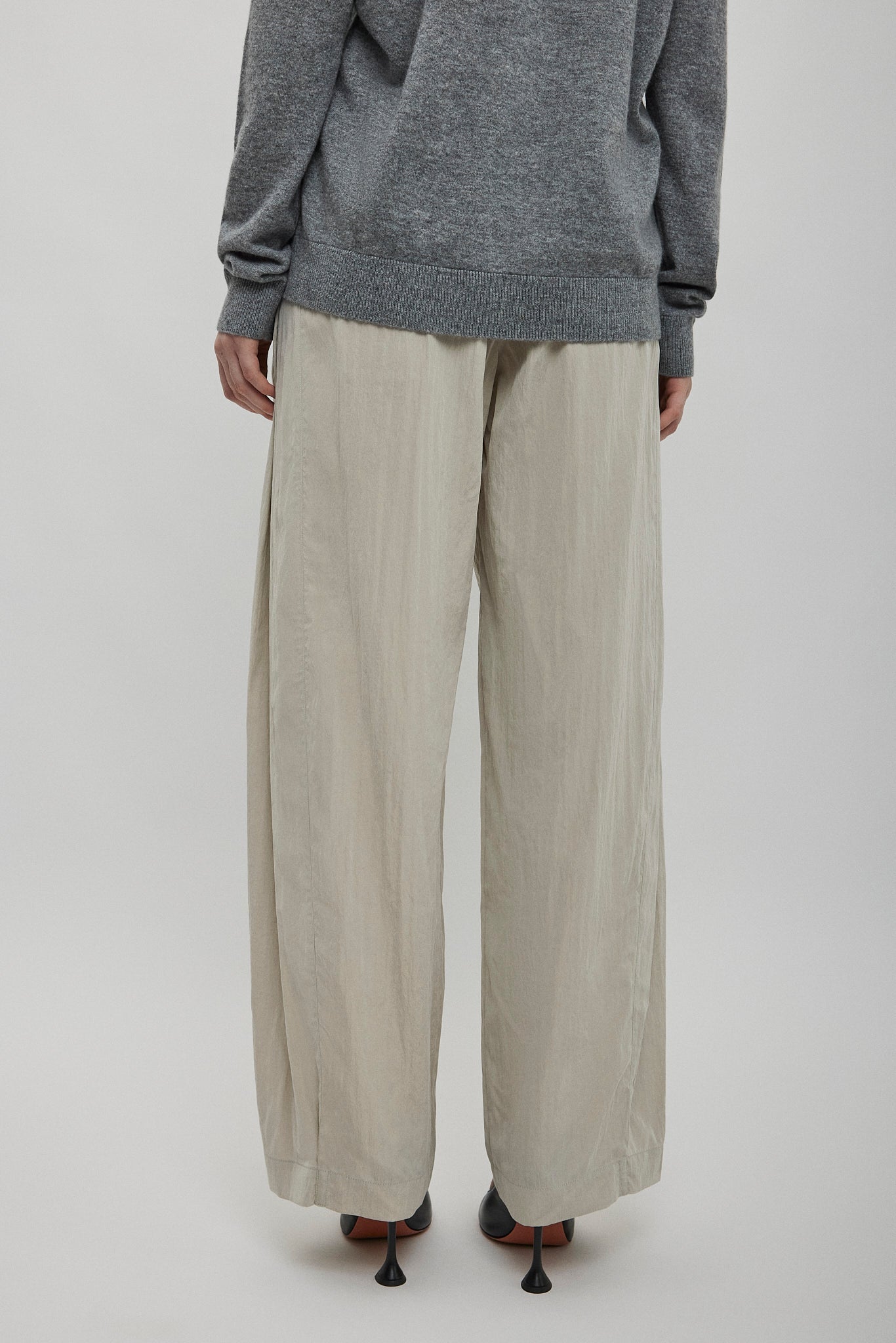 Grey silk pants from The Row. The Iven low-rise pants are made in softly crinkled technical silk with barrel leg, front double pleats, adjustable back button tabs and side welt pockets.