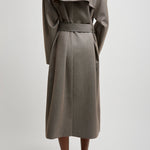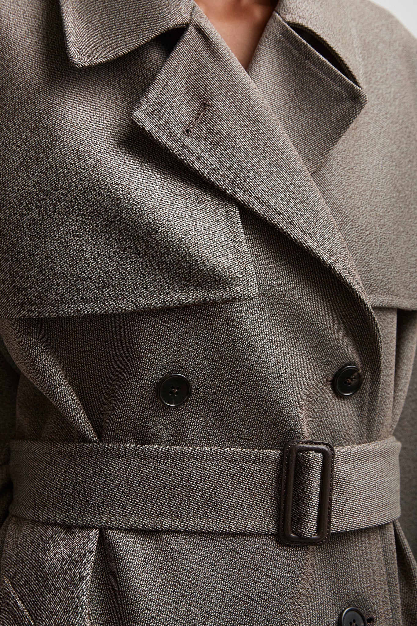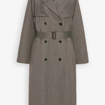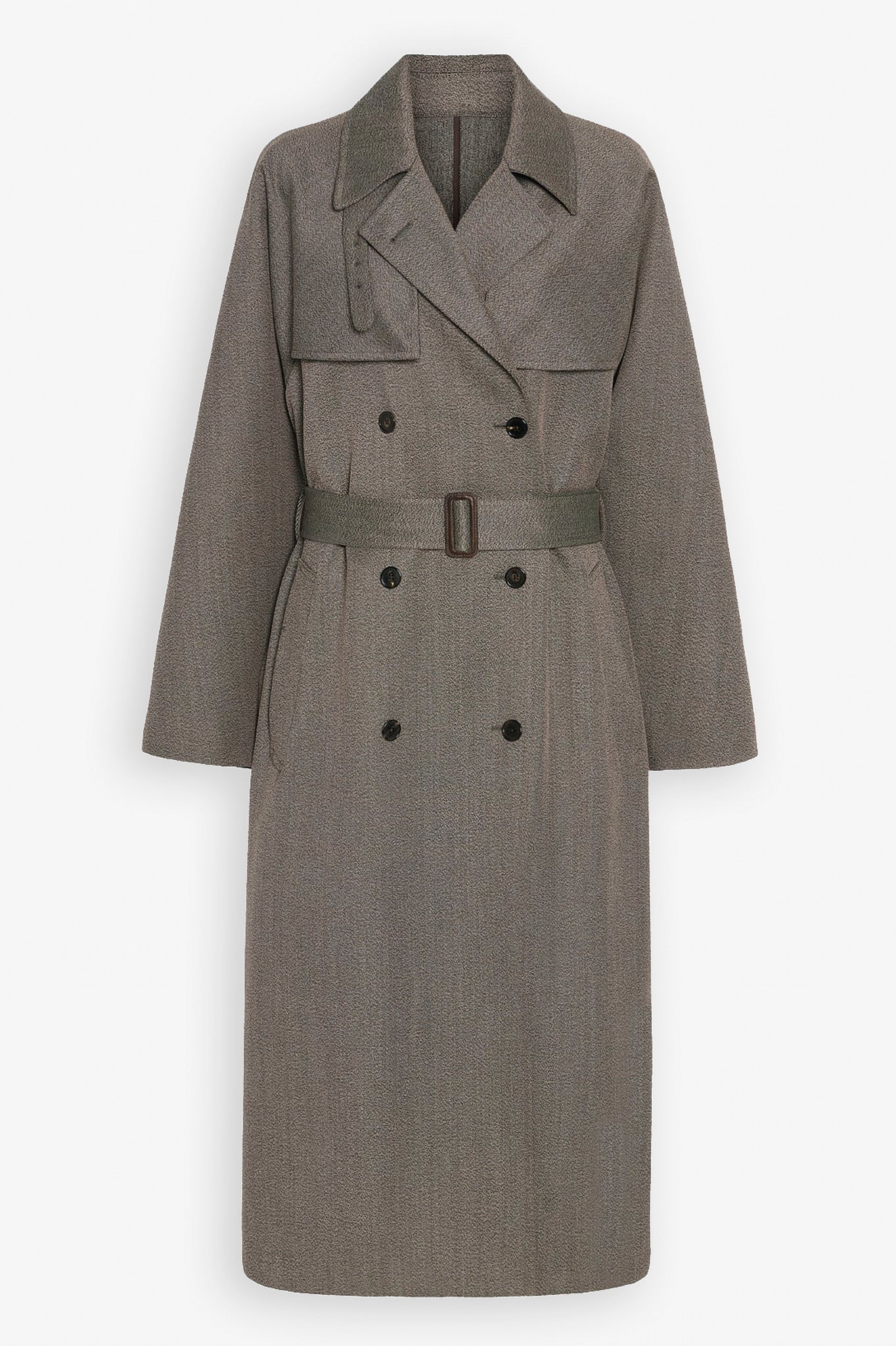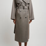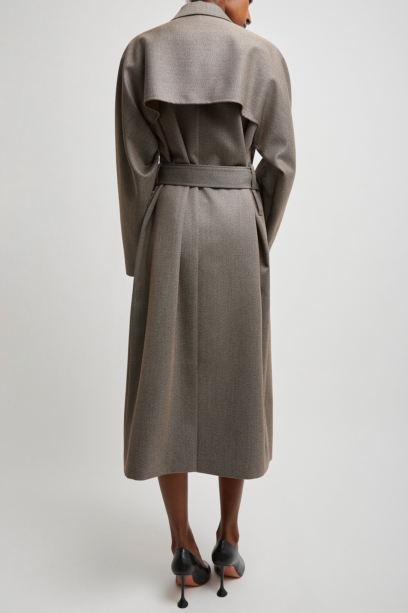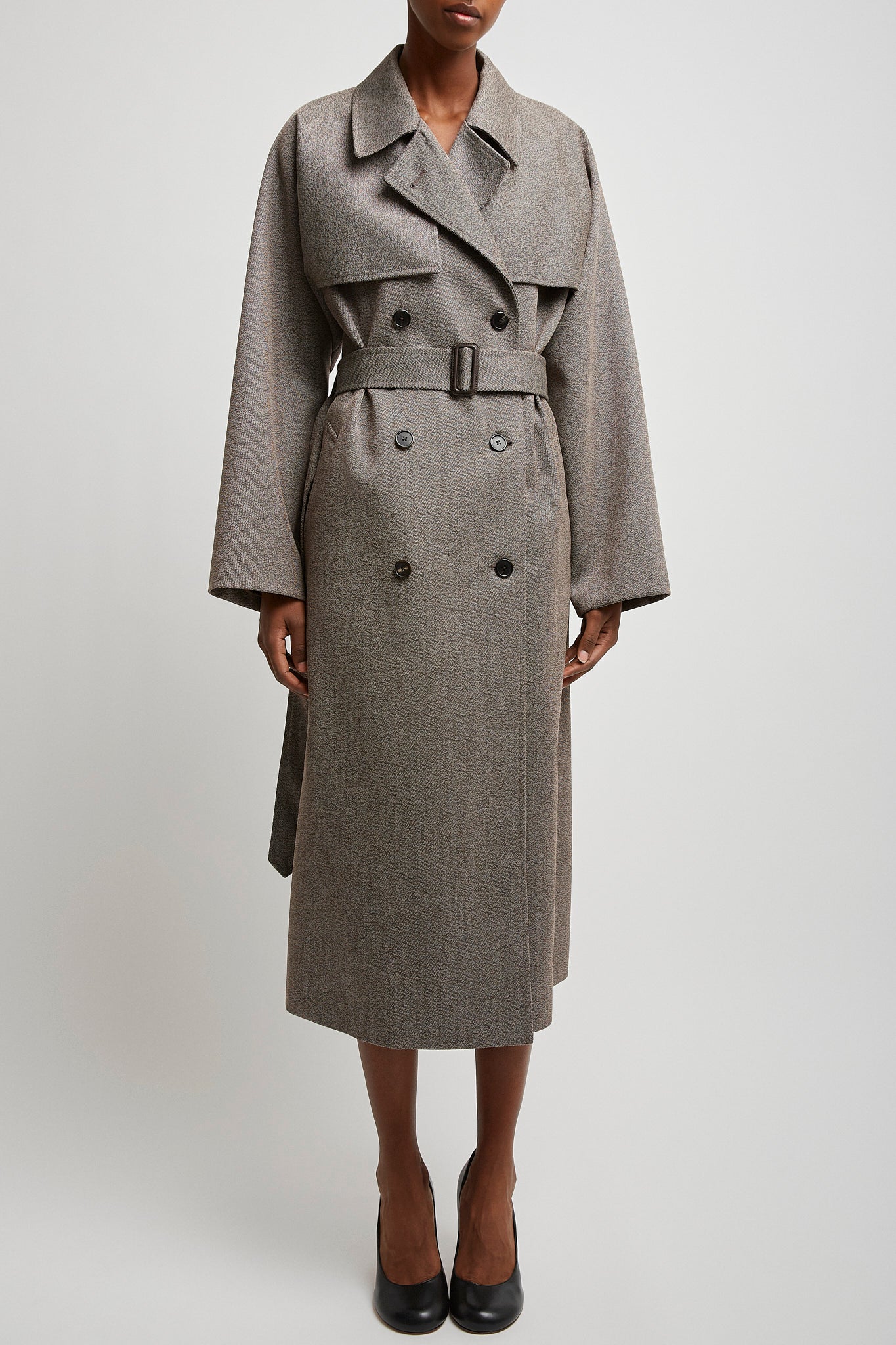 Black and light brown gabardine coat from The Row. The Rhydian oversized double-breasted trench coat is made in sleek virgin wool gabardine with slant welt pockets, horn button closure, and removable belt with buckle.
