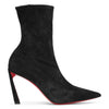 Black suede ankle boots from Christian Louboutin. The Condora boots are made of suede with an elastic collar and pointed toe, mounted on an 85mm slanted stiletto heel.