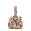 Rose Marie light beige bracelet bag from Alaia. The bag has a signature cut-out design, a leather tie at the front, and a leather top handle. A detachable mirror incased in logo-engraved leather completes the look.