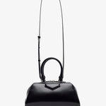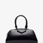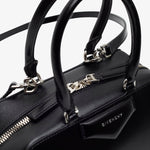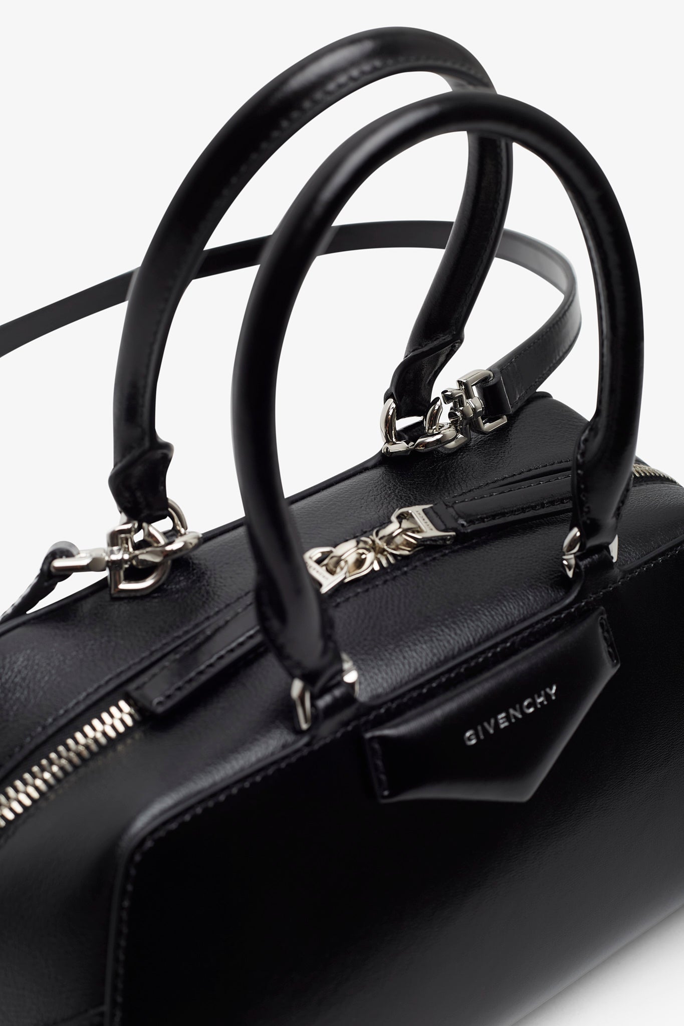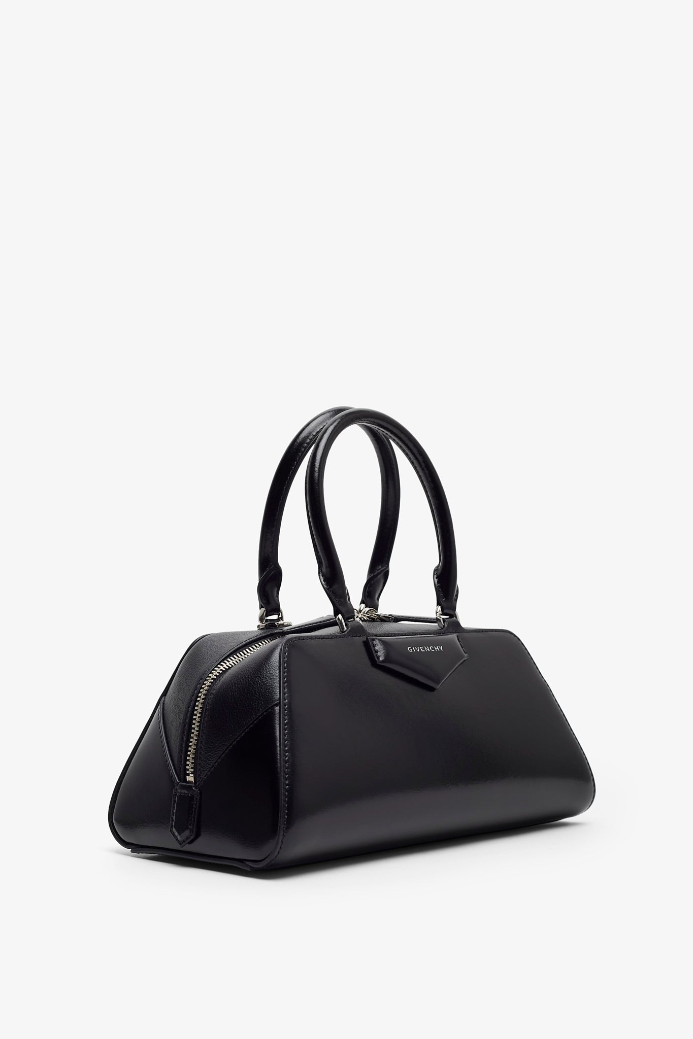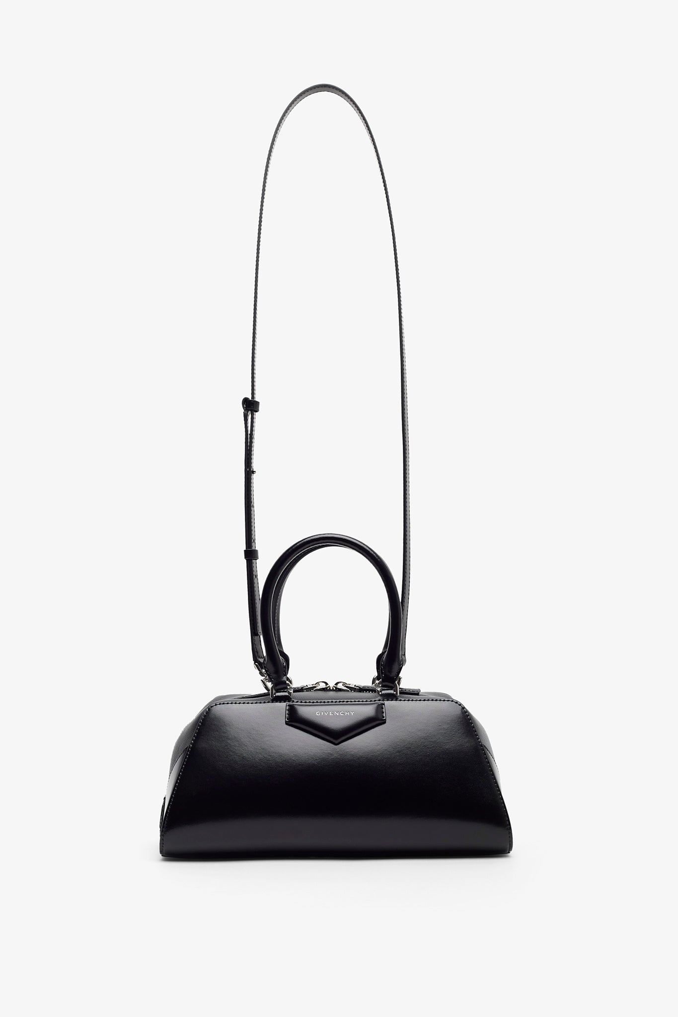 Black leather handbag from Givenchy. The Antigona east west small handbag is made of calfskin leather, in a long east-west shape with origami-style gusset construction with zipped closure. It has articulated leather handles with four D-rings for the shoulder strap, complete with an adjustable and removable leather shoulder strap.