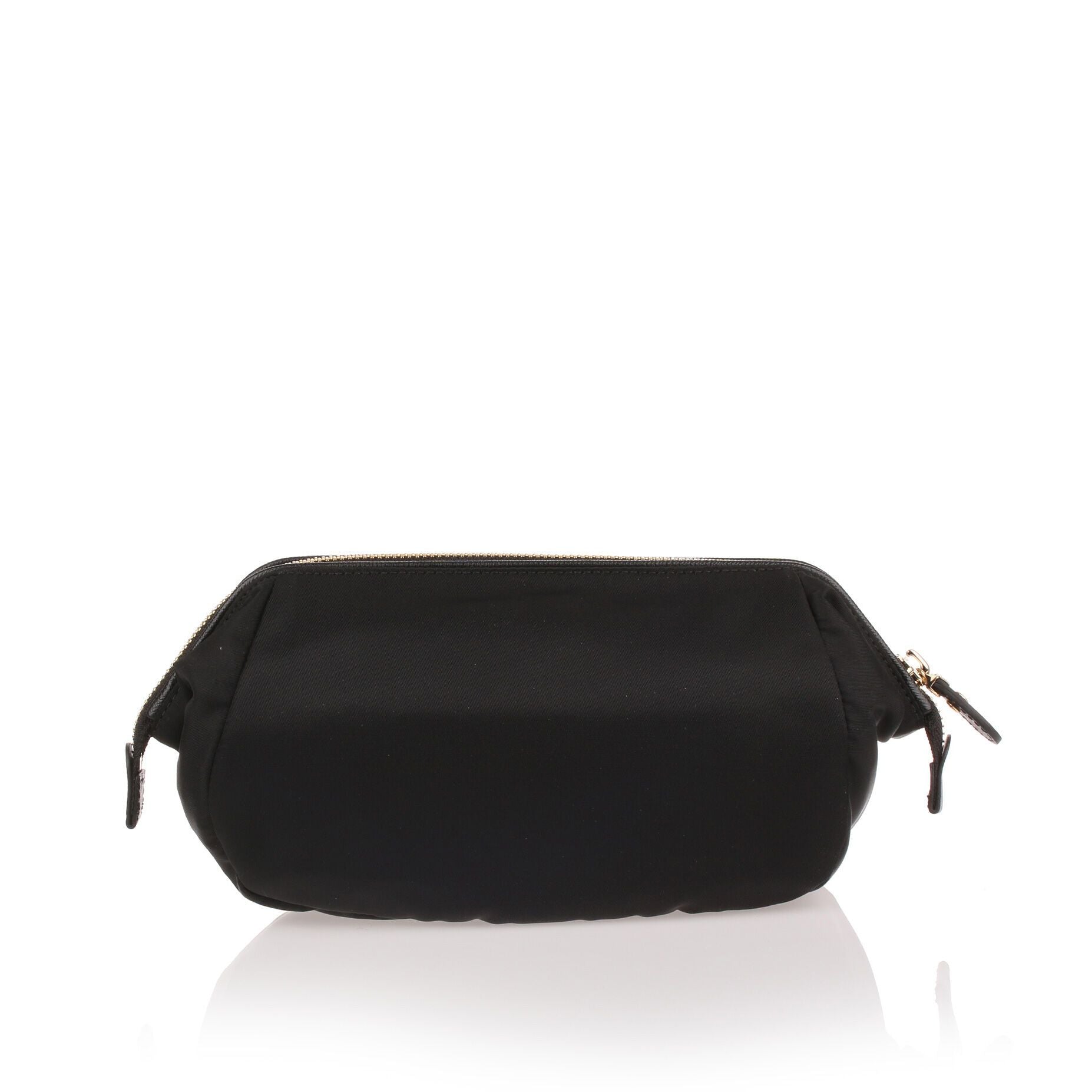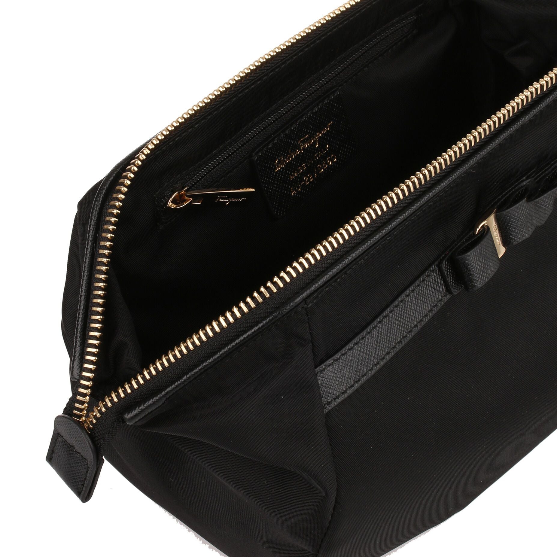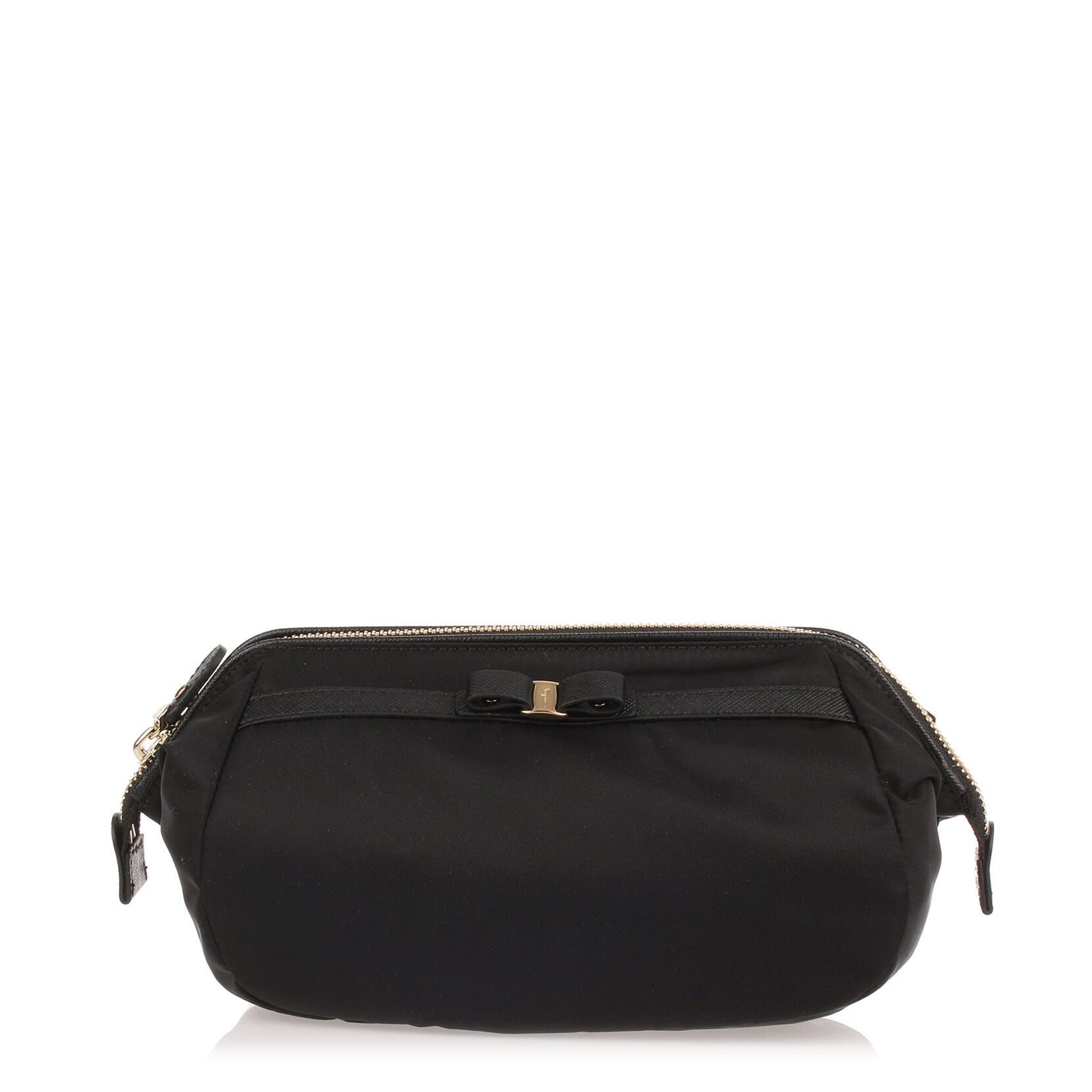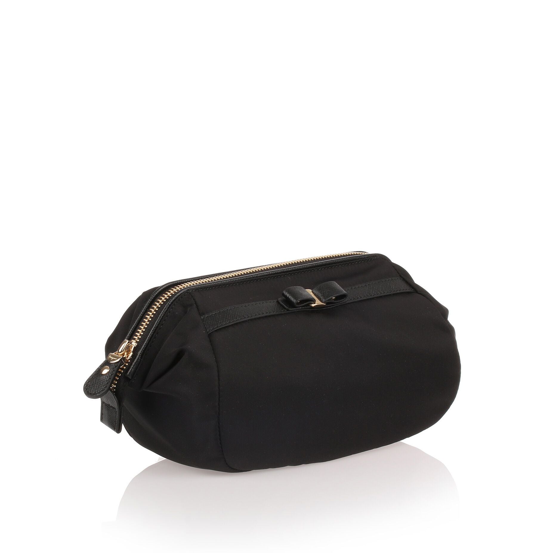 Black nylon and leather cosmetics bag from Ferragamo. The bag has a leather signature Vara bow on the front, a gold-tone zip closure, and a reinforced top for stability.