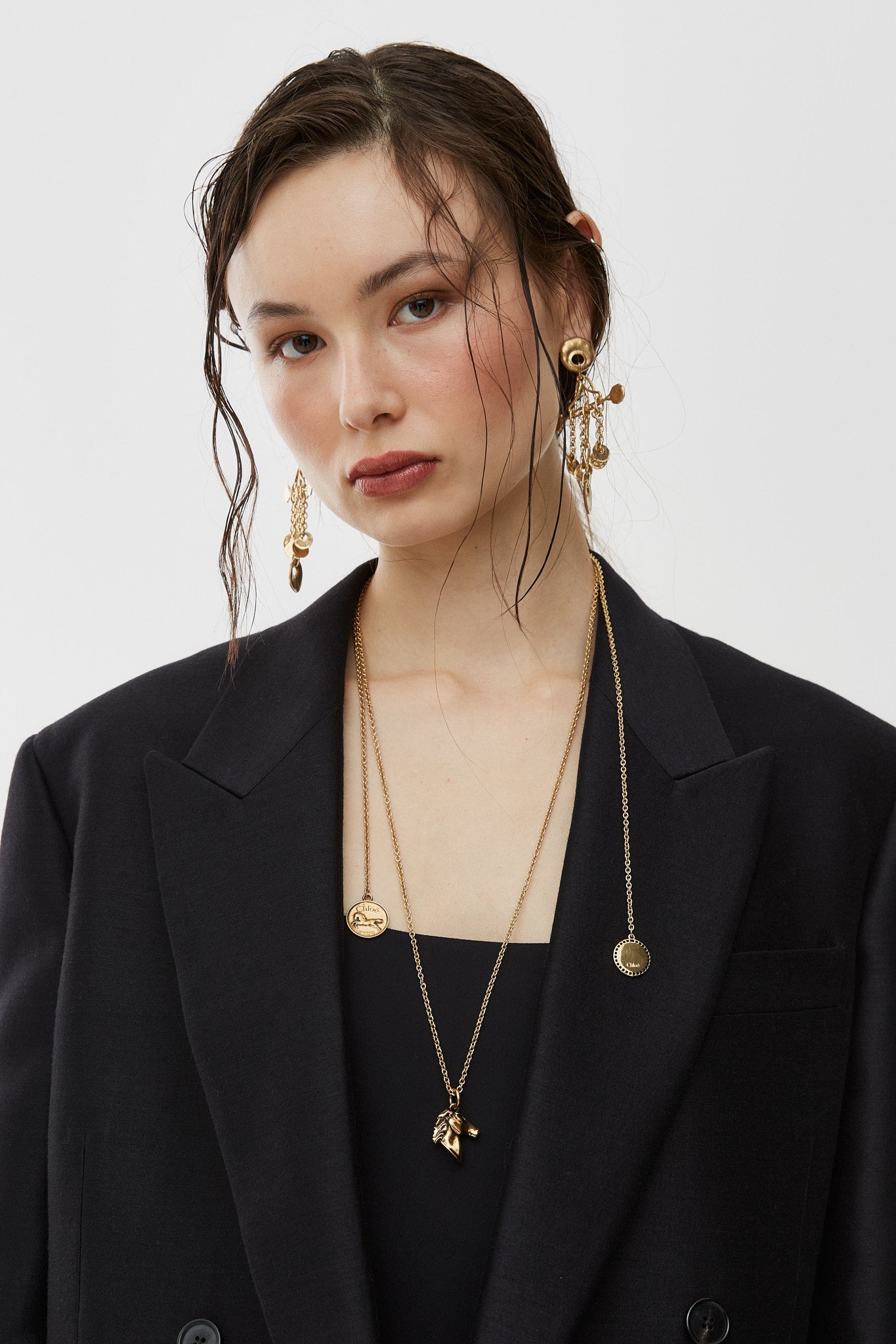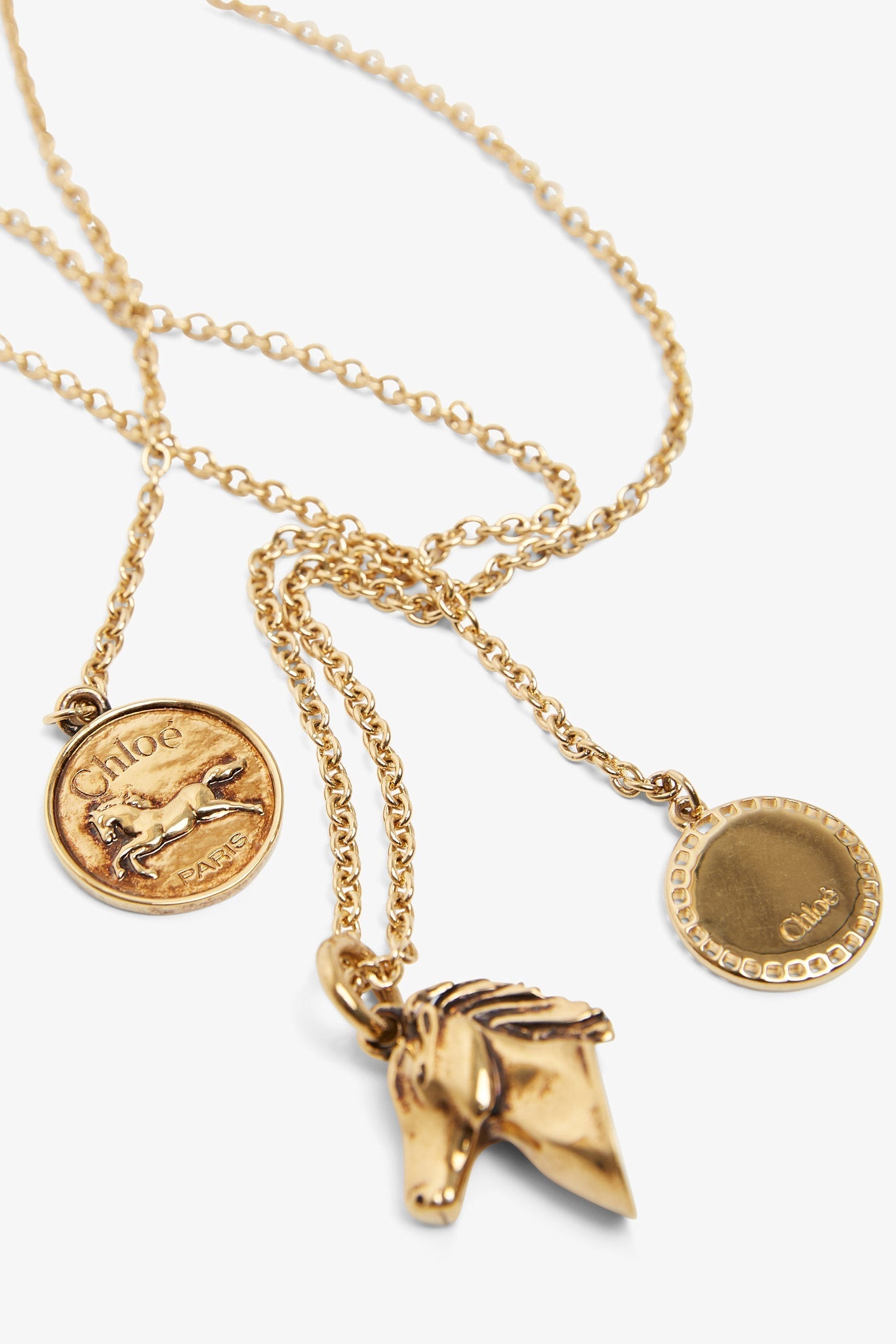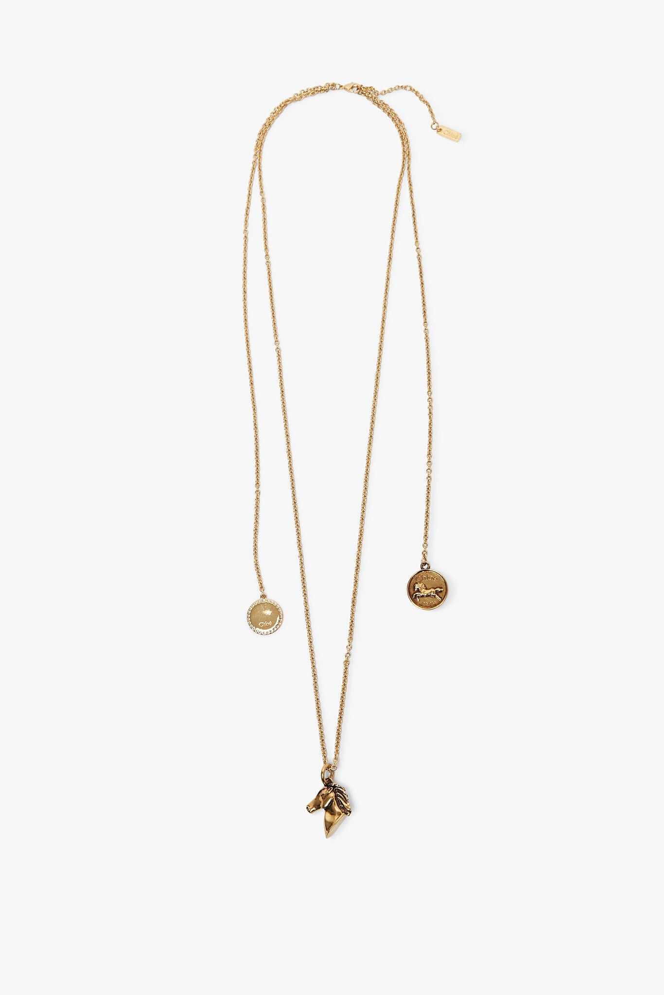 Gold brass necklace from Chloé. The Charms necklace are made of vintage gold brass. It has an adjustable double chain, detailed with three pendants rooted in the Maison’s DNA: a horse head and two medals. One is contoured with a lace-effect trim and the other signed with the Chloé Paris logo.