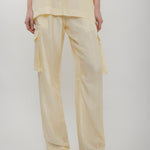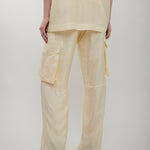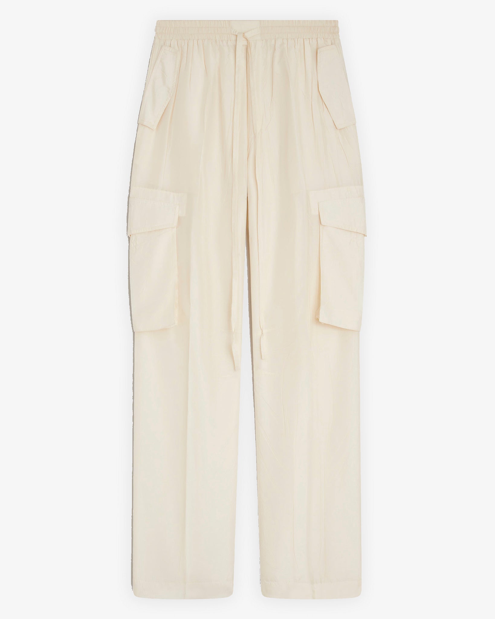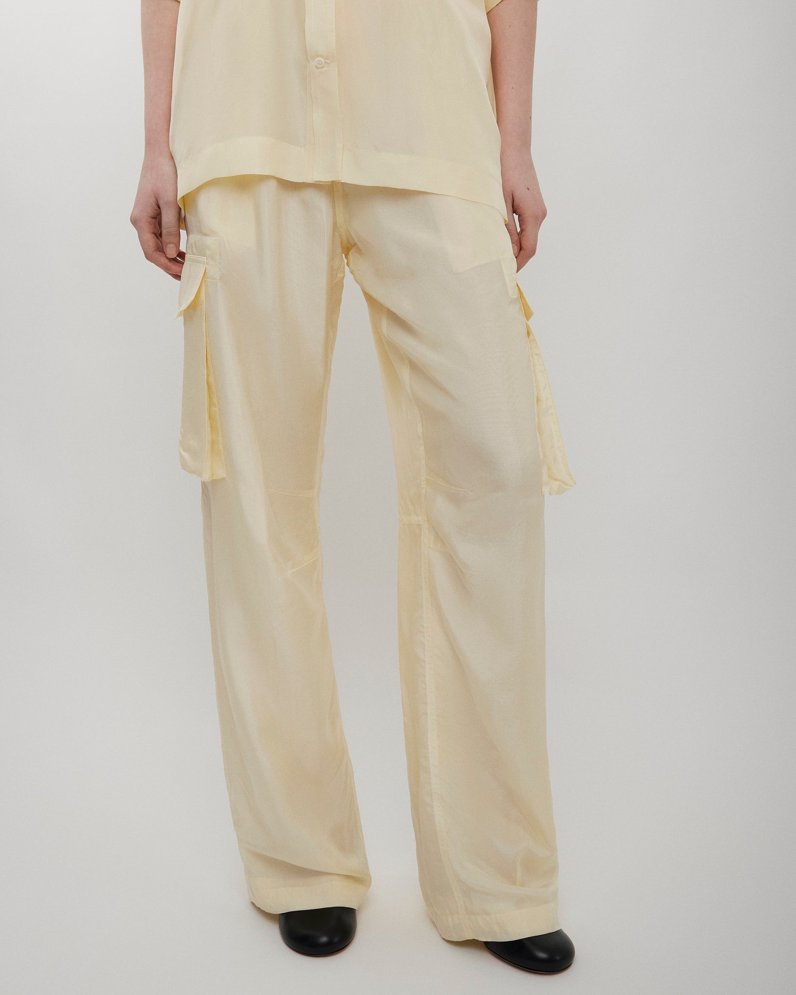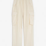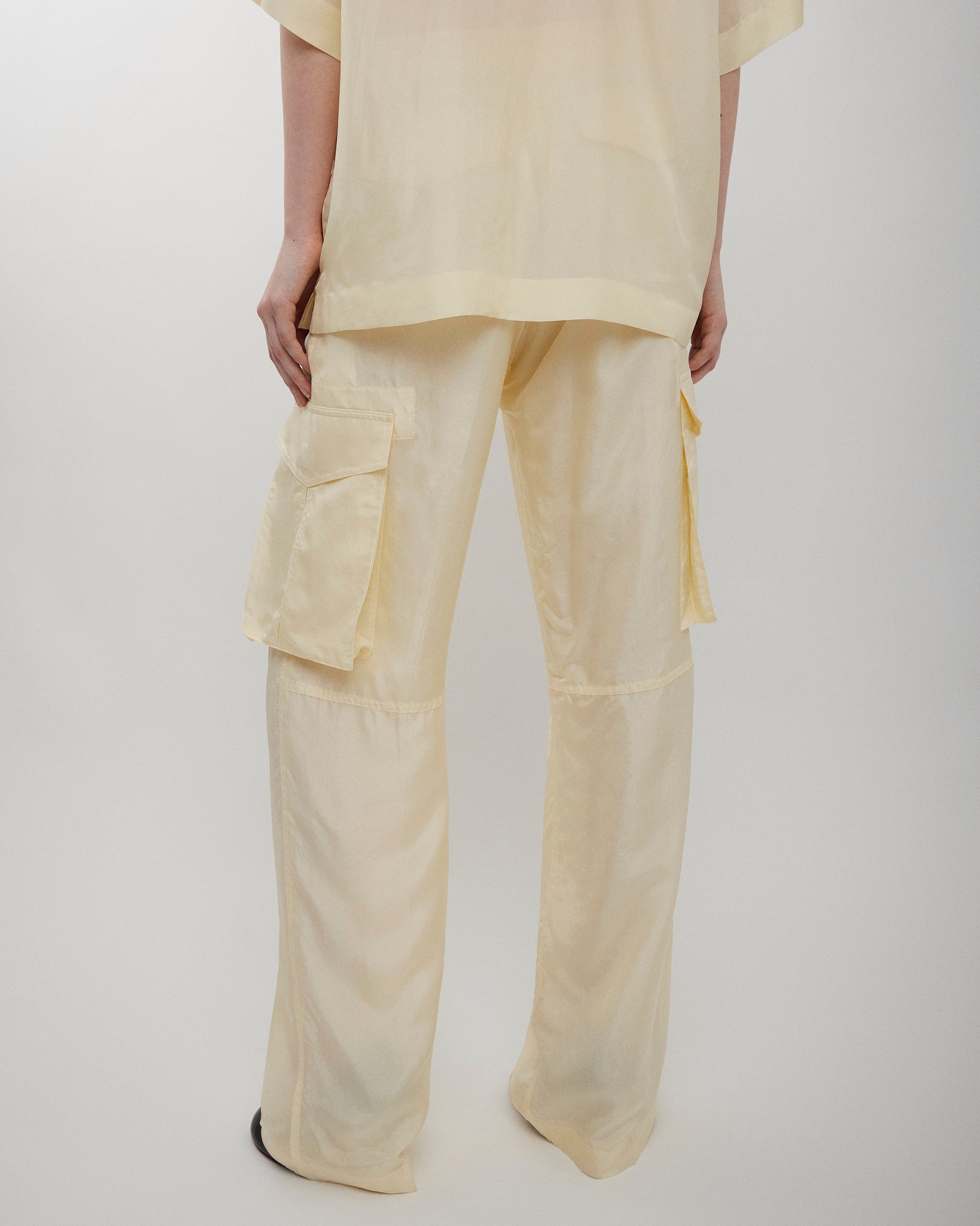 Cargo trousers in vanilla habotai silk from Phoebe Philo. Elasticated drawstring waist, the eased fit is amplified by the fluid fabric. Sharp pressed and washed with a slight sheen.