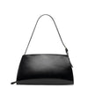 Black leather shoulder bag from The Row. The Dalia baguette bag features clean lines and a geometric silhouette. It is made of polished leather with a top handle and zip closure, complete with an interior slip pocket.