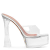 Transparent pvc mules from Amina Muaddi. The Dalida pvc mule sandals are made of transparent pvc, set on a towering sculptural heel measuring 140mm. The platform measures 45mm.